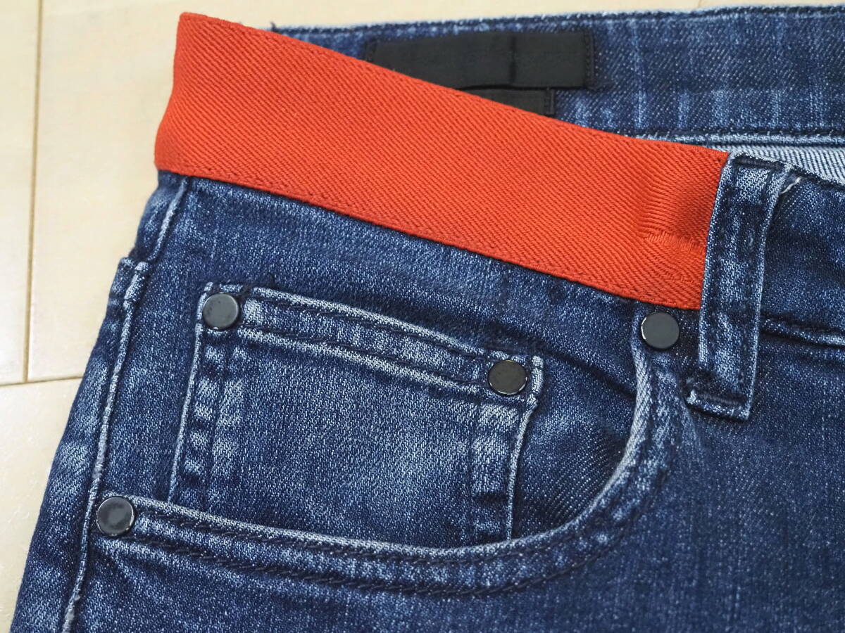 フロントはボタンフライ、ウェスト部分が赤い生地で切り替えられたデザインです。