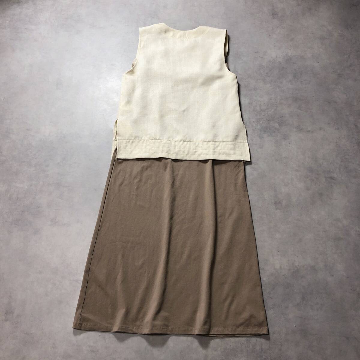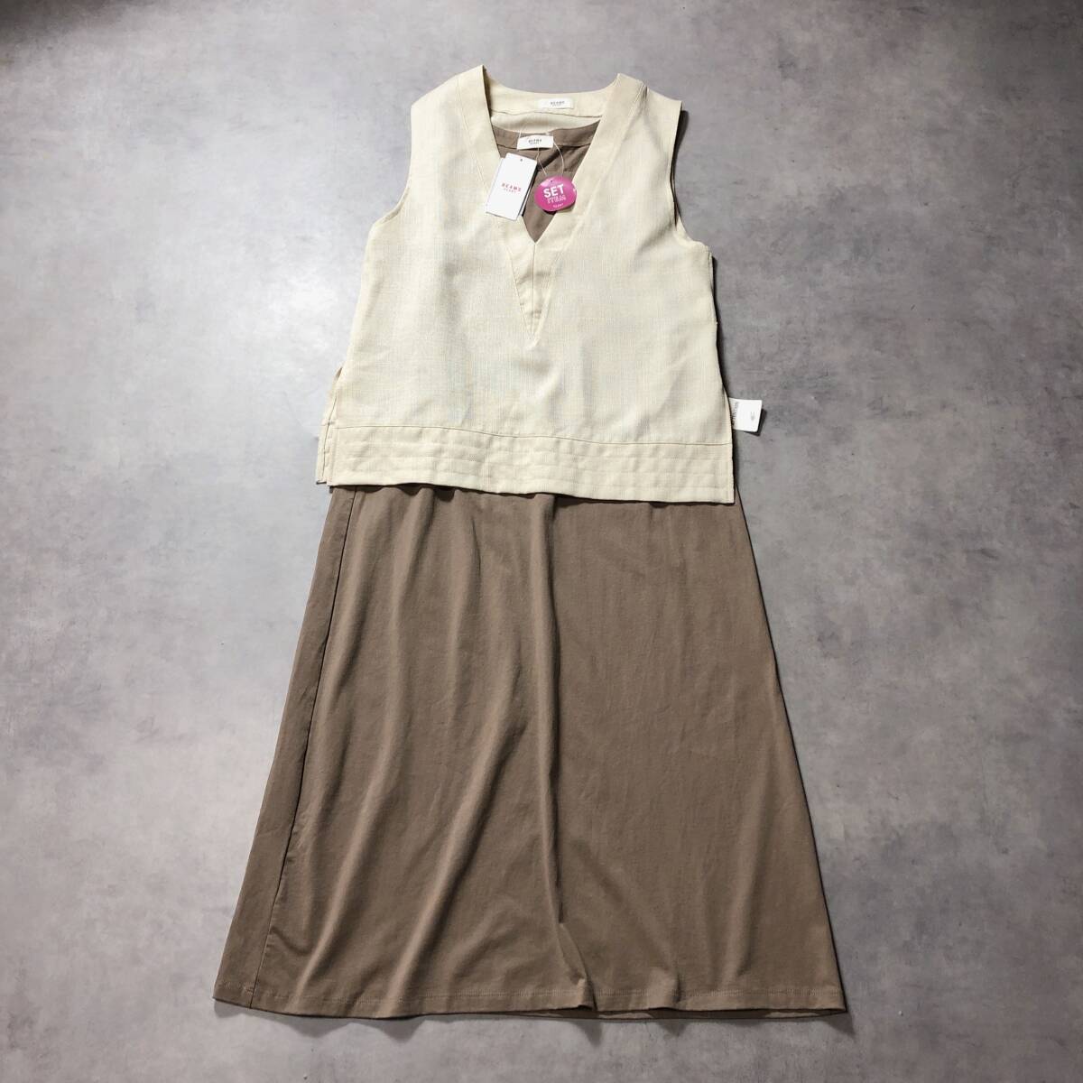 WQ788● BEAMS HEART:ベストカットソーワンピース (セットアイテム) ●FREE● BEIGE×IVORY 定価7900- Vネックベスト ノースリーブ