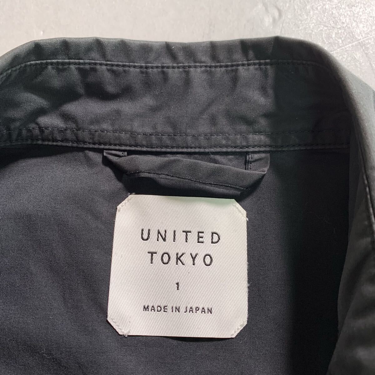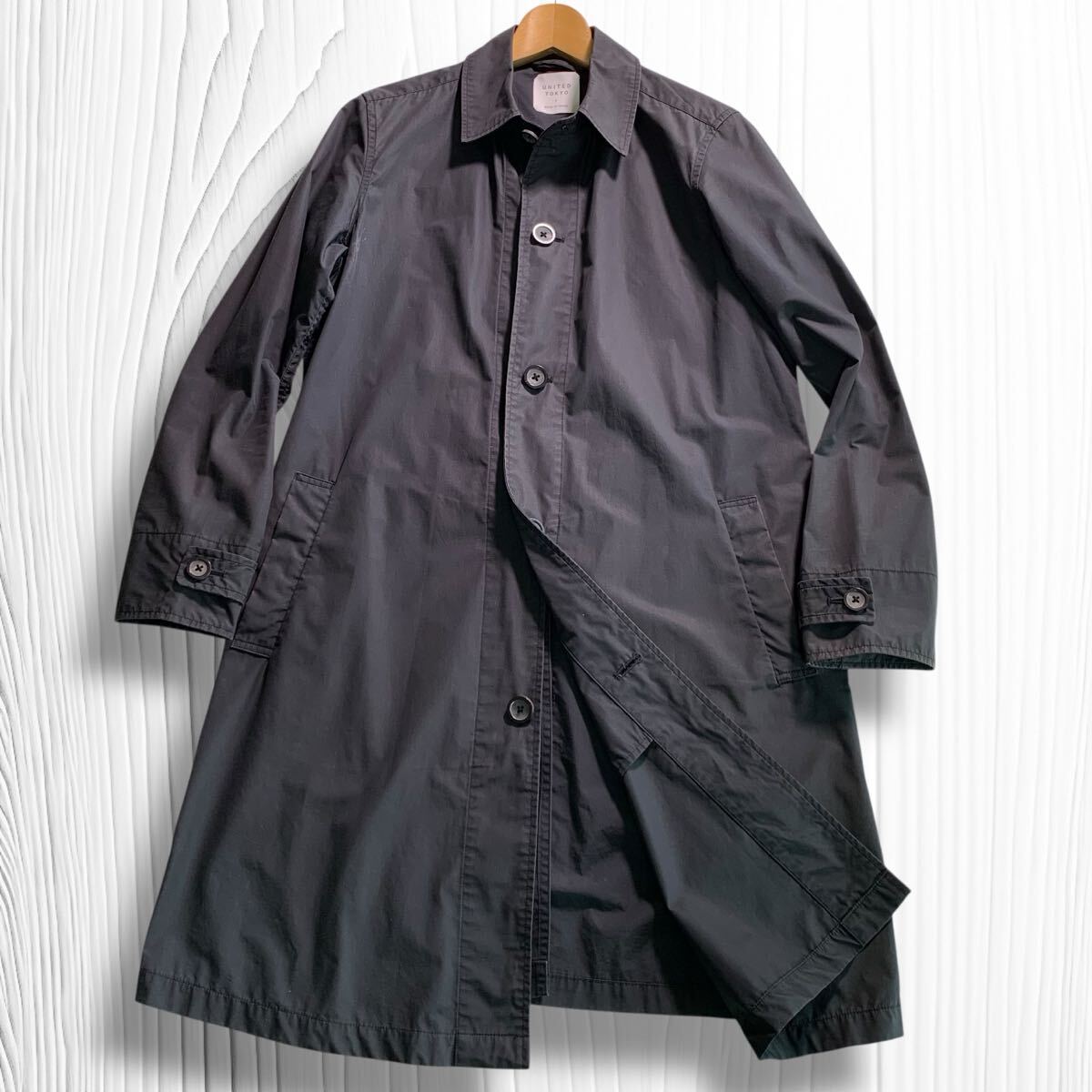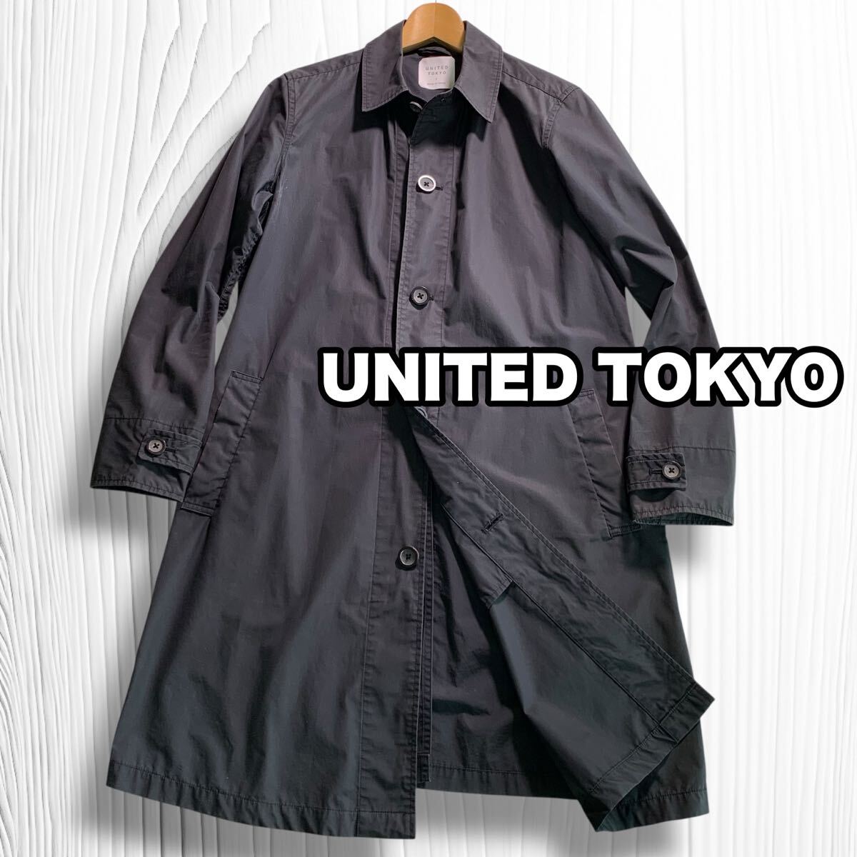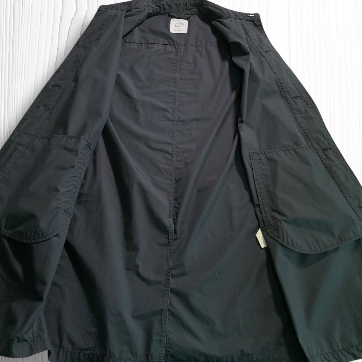 ダークネイビーのUNITED TOKYO製ステンカラーコート、バックスリットデザインとロング丈が特徴。