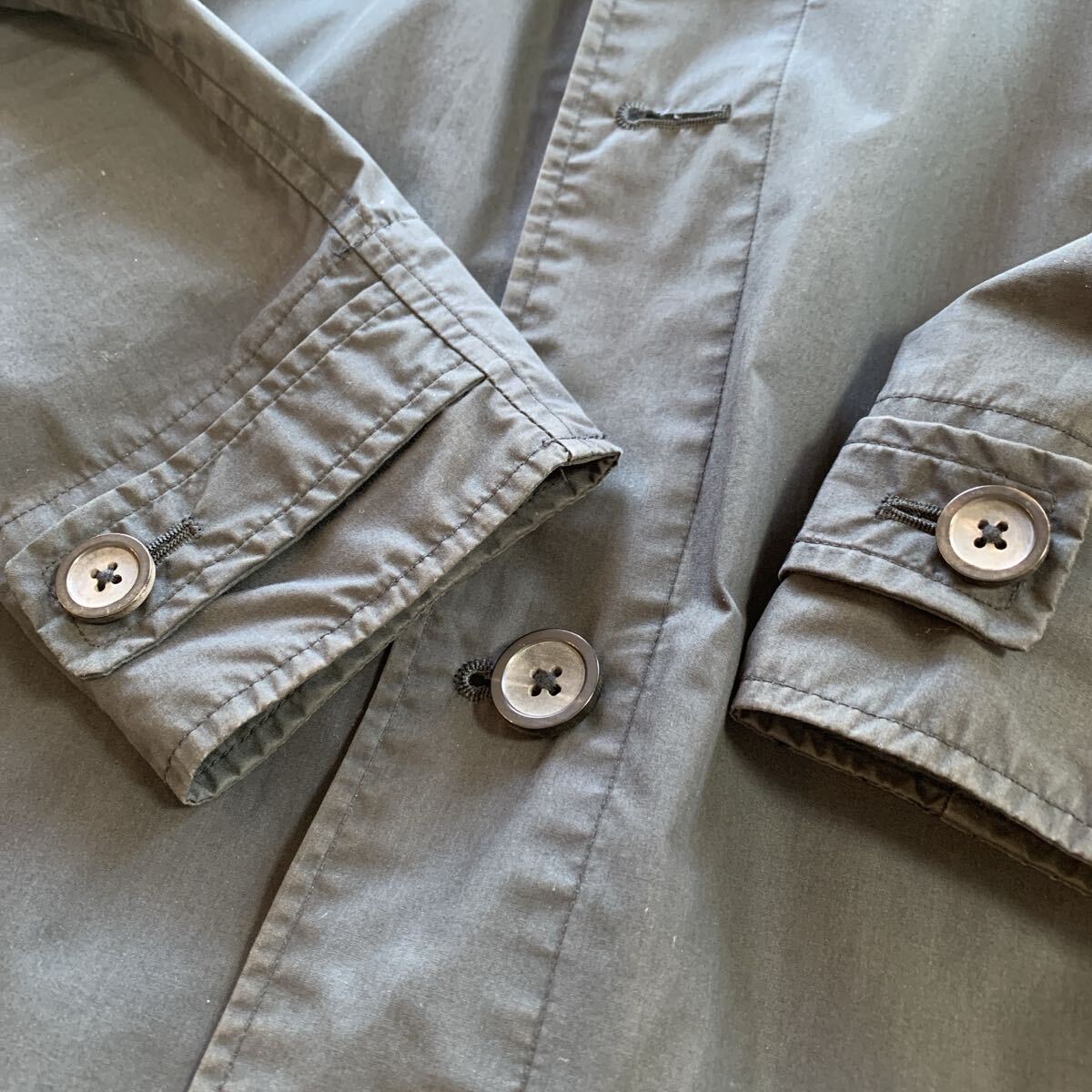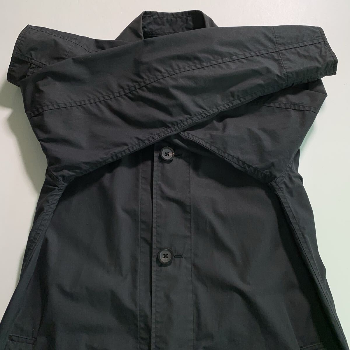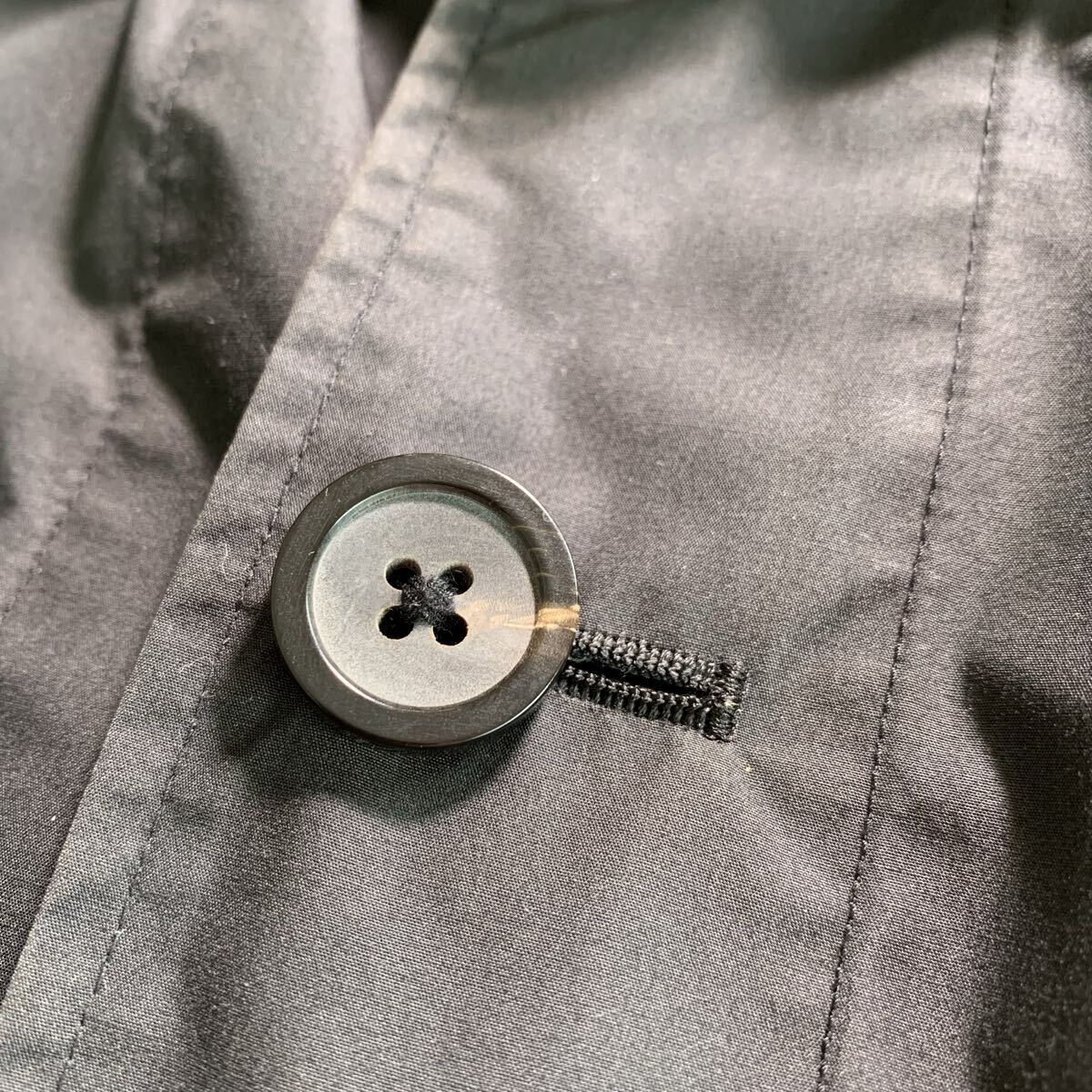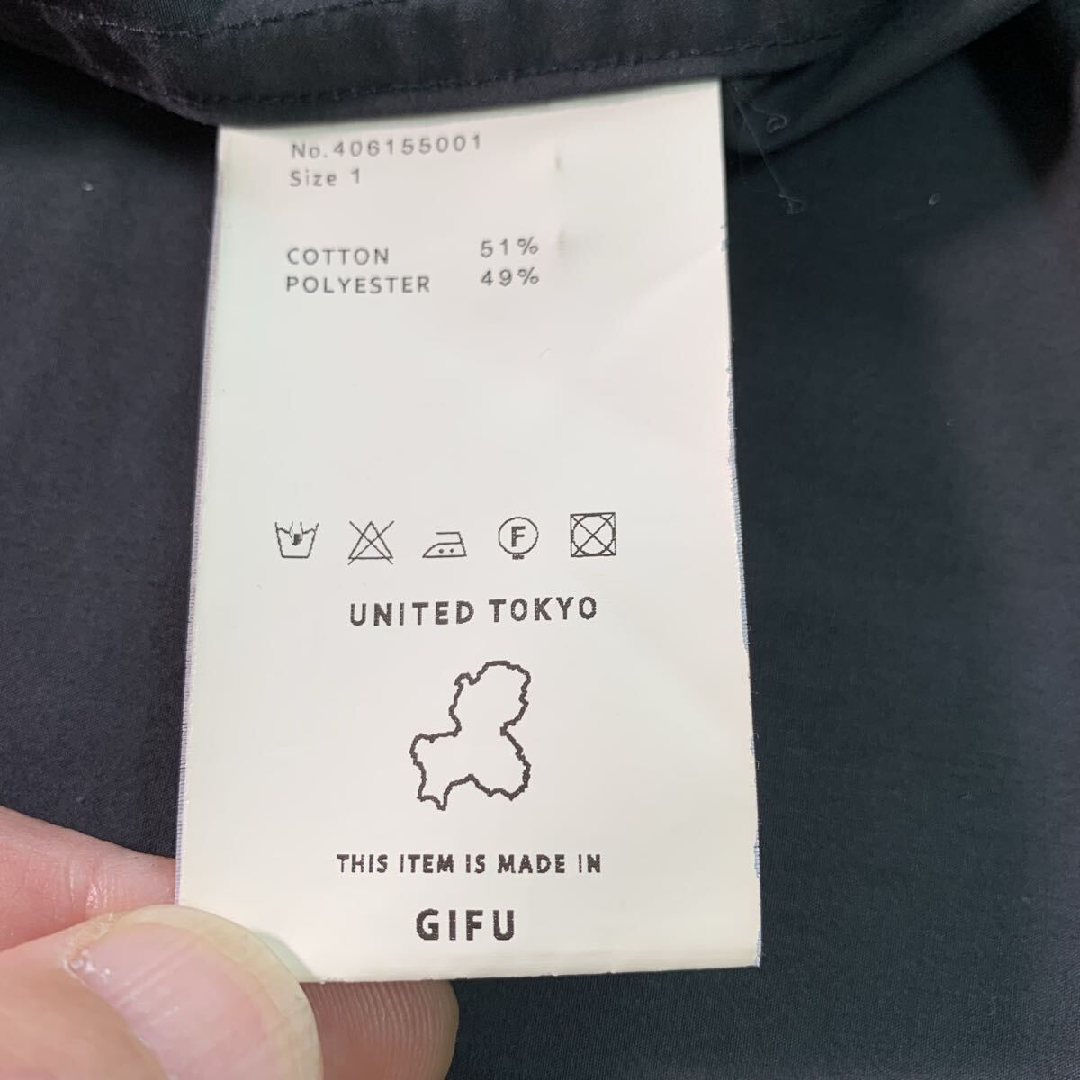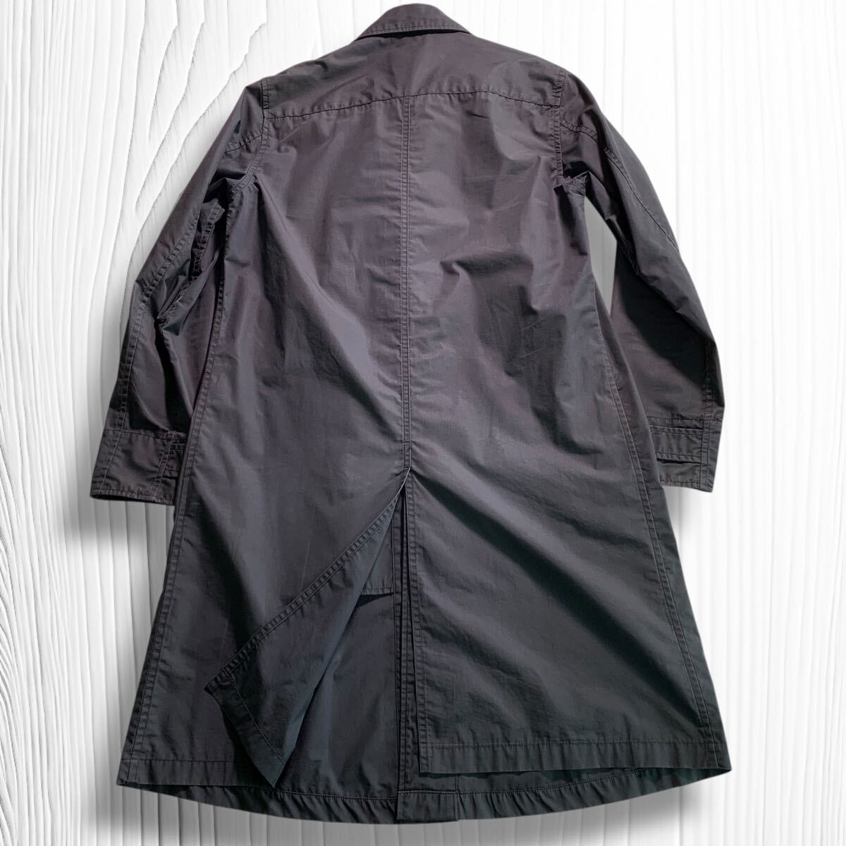 ダークネイビーのUNITED TOKYO製ステンカラーコート、バックスリットデザインとロング丈が特徴。