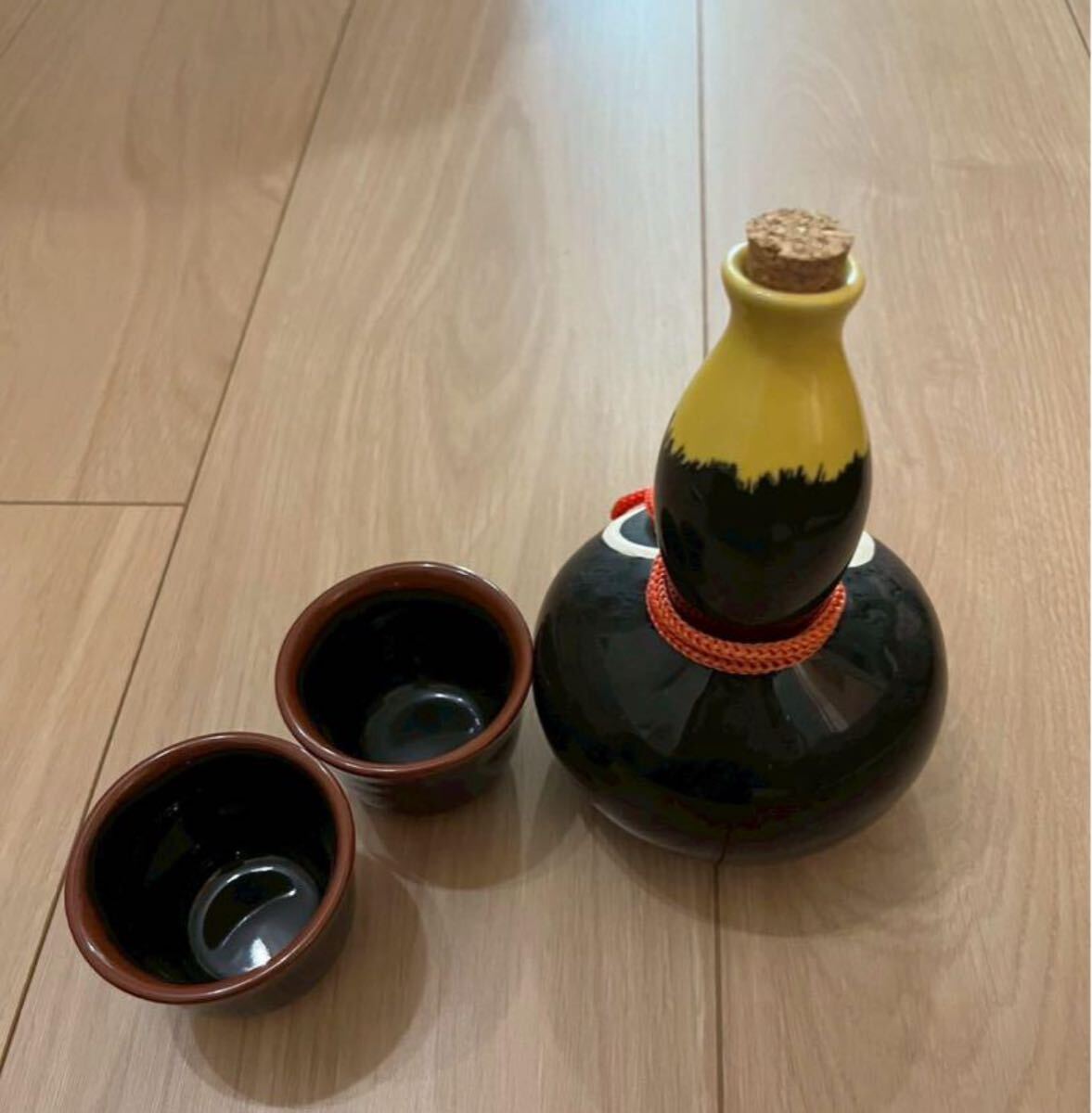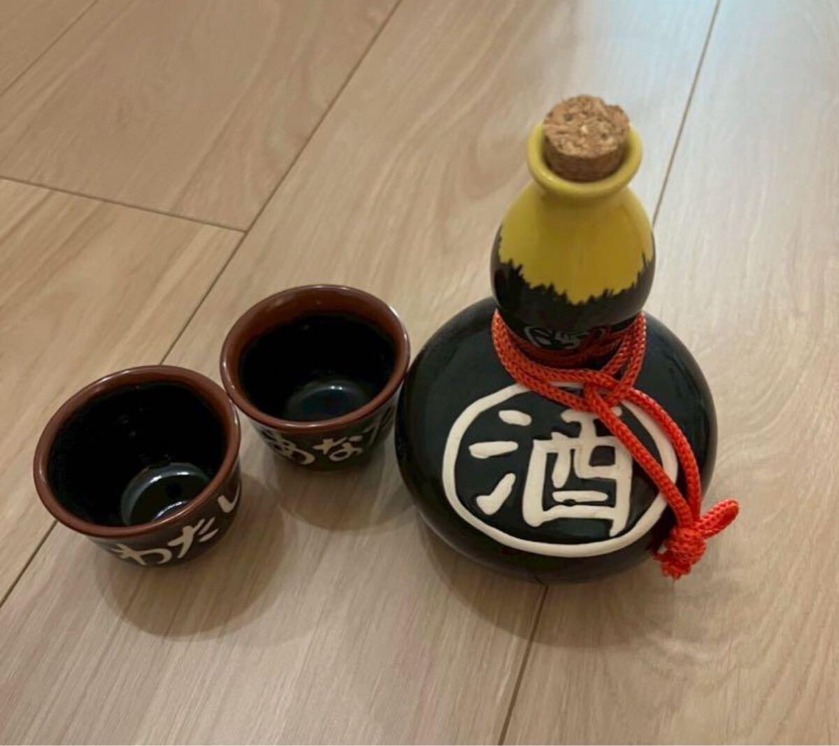 陶器製の徳利とおちょこのセット、酒の文字が特徴的。