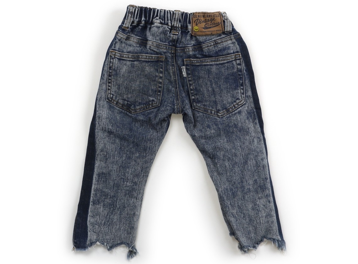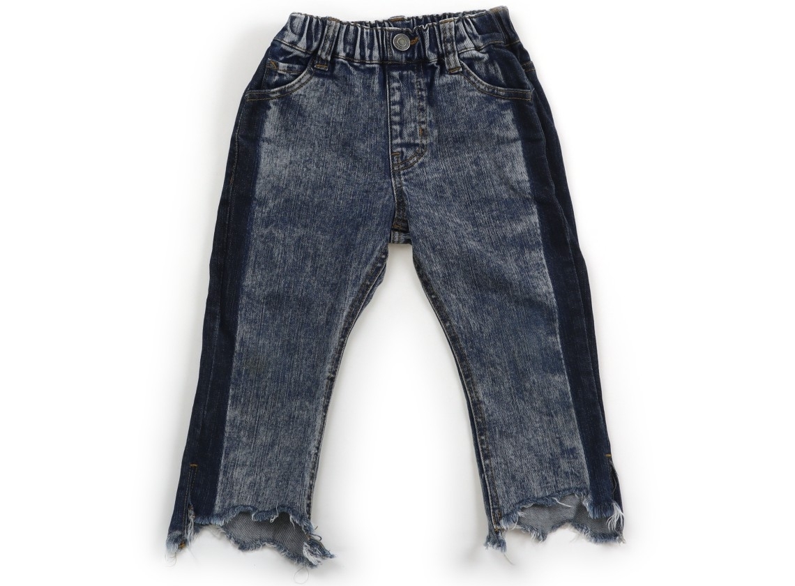 ウエストは総ゴム。ポリエステル混デニムパンツです。裾は切りっぱなしデザイン。デニムに色落ち、後ろ布タグに色褪せ、膝に黄色いシミあり。外遊び用にいかがでしょうか。