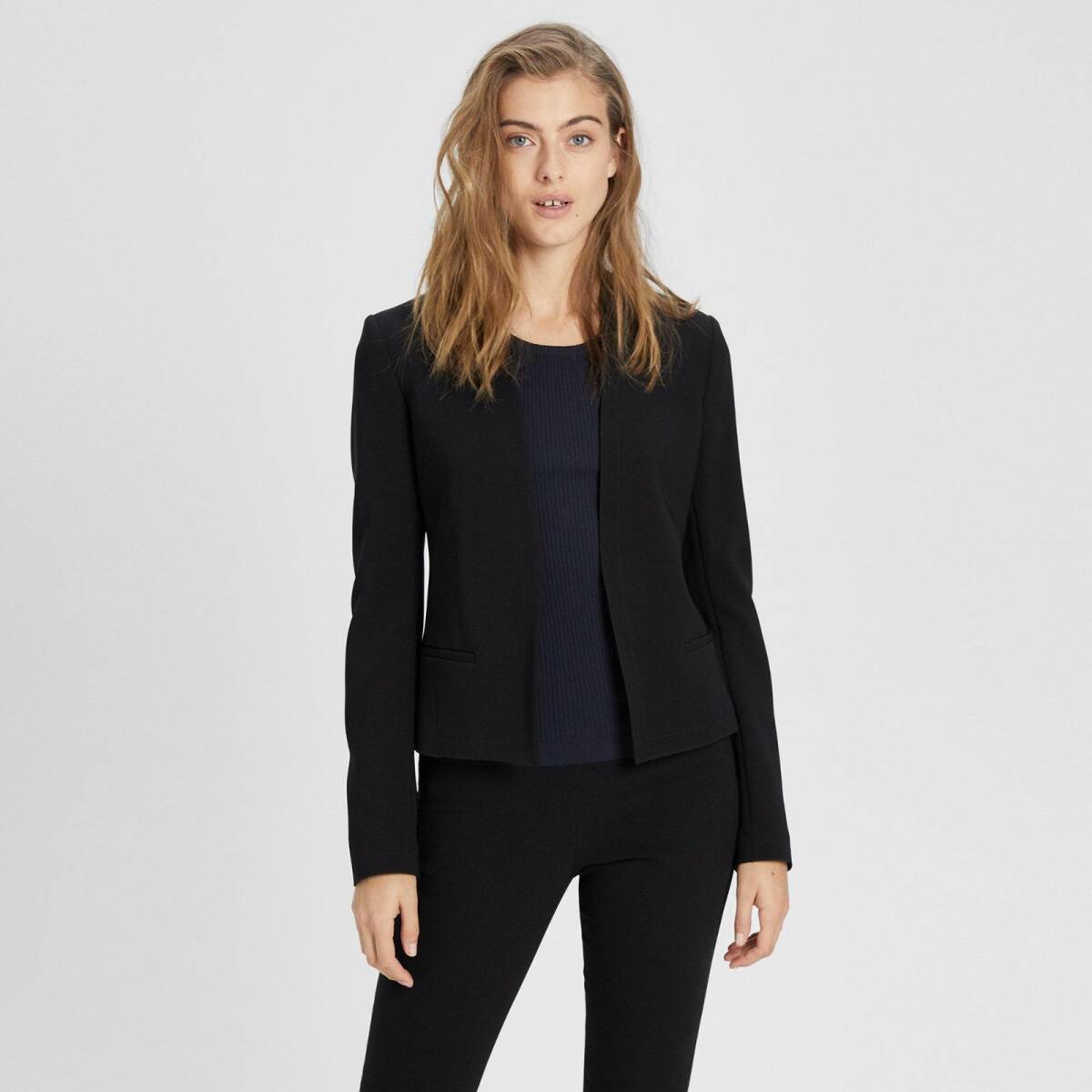 クリーンな印象のノーカラージャケット。後ろ身頃は曲線を描くシームラインで、女性らしいフレアなシルエットに仕上げました。パンツはもちろん、ドレスとも合わせやすいコンパクトなシルエットも◎。ドライなタッチで適度なハリがあり、ロングシーズン活躍します。
