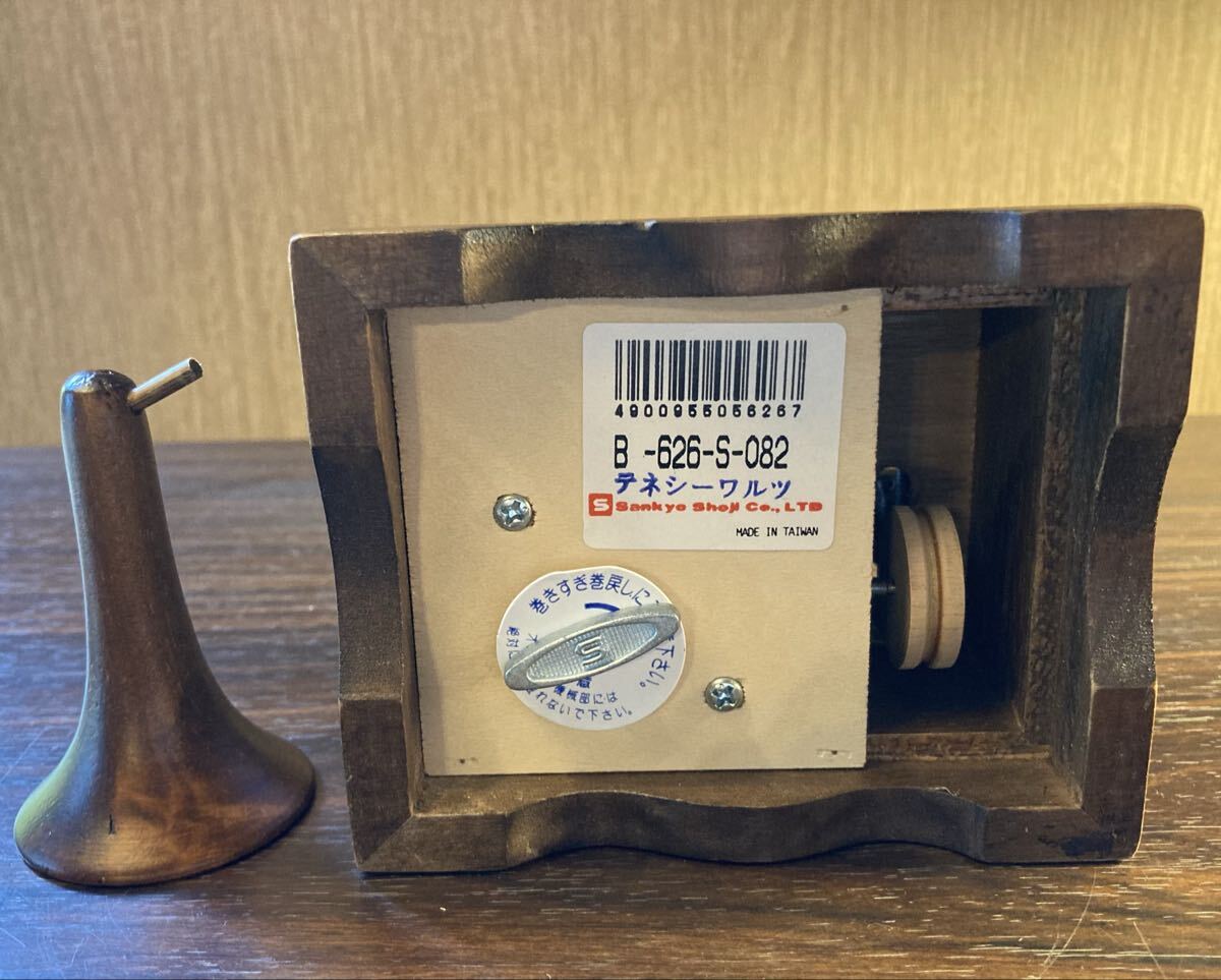 底面のネジを巻いて、側面のレバーを引くとテネシーワルツが流れます。ラッパ部分は取り外し可能で軸も移動できます。