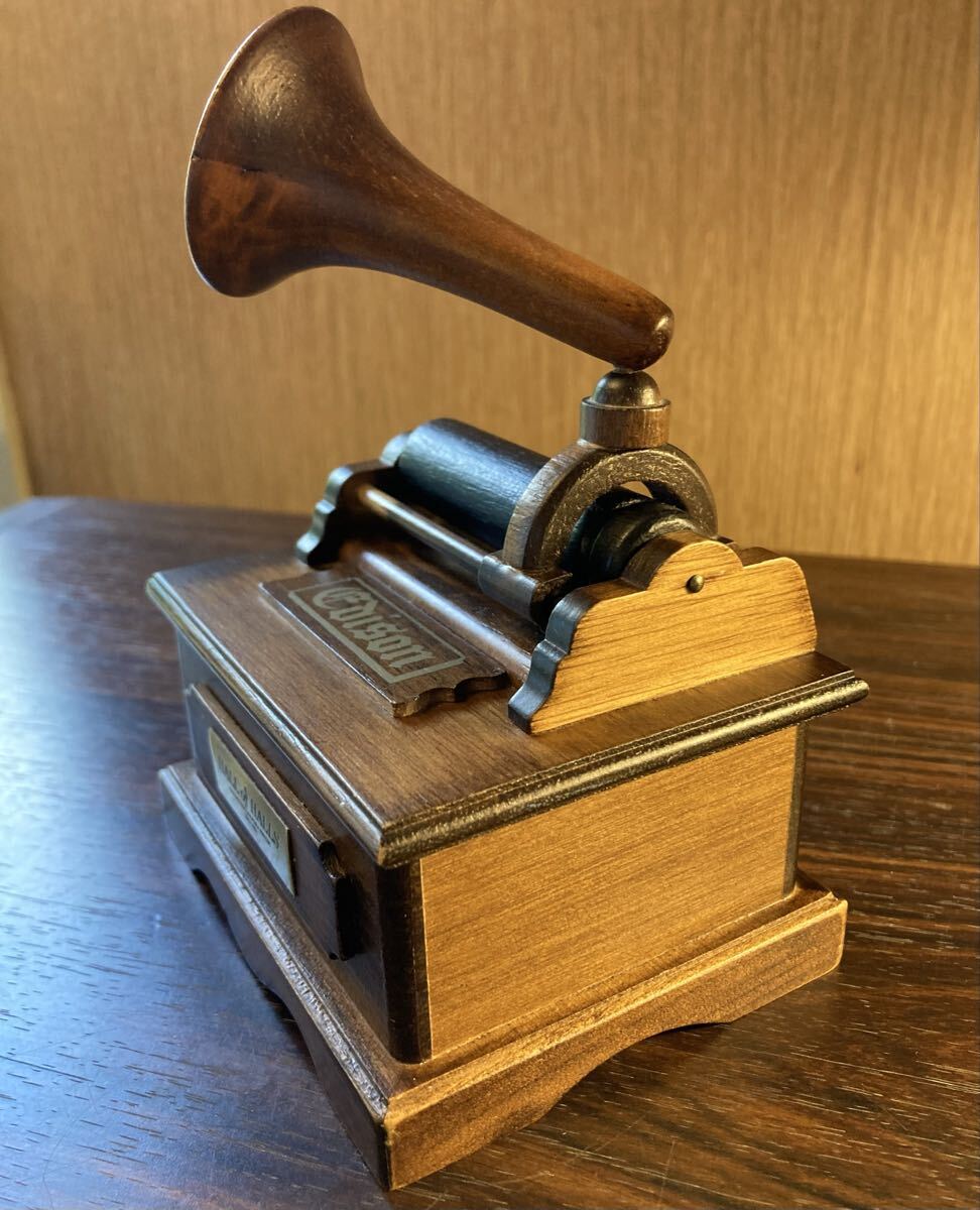 古めかしい蓄音機を模した手巻きのオルゴールとなります。