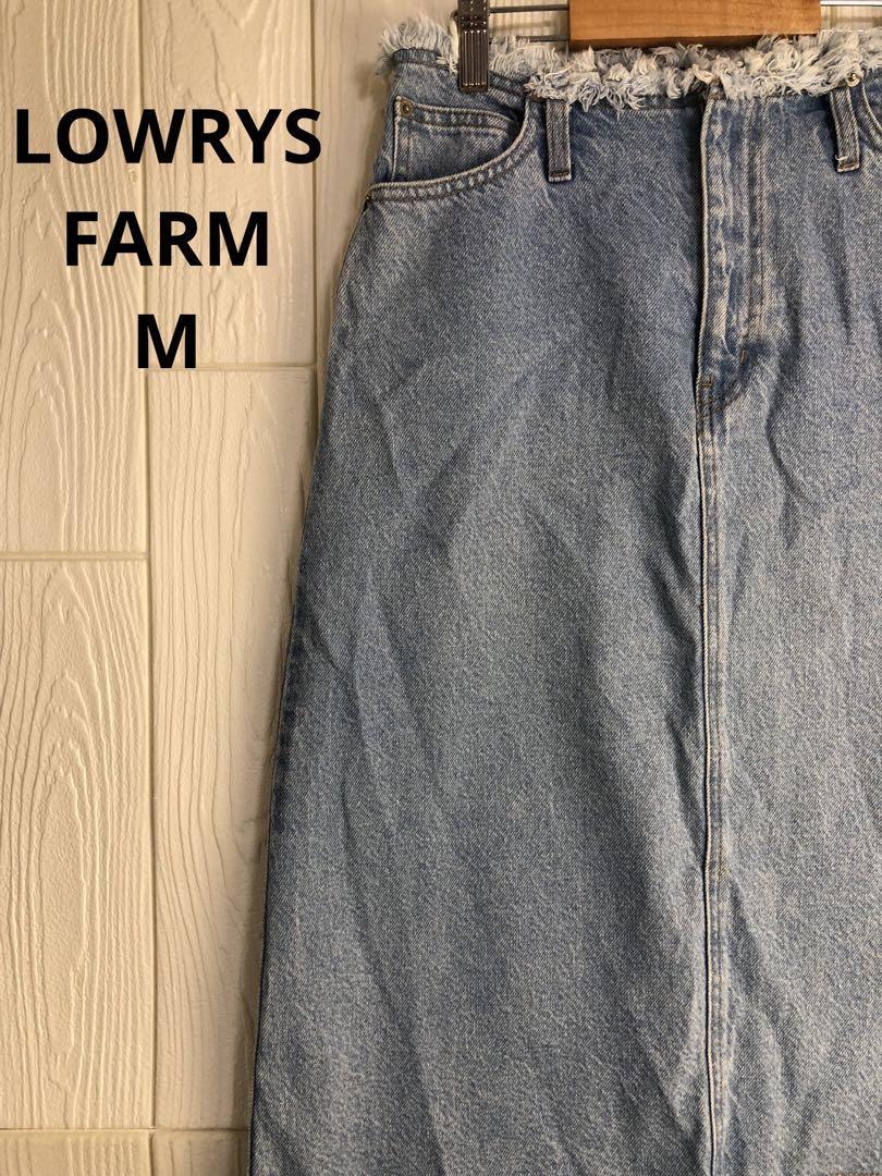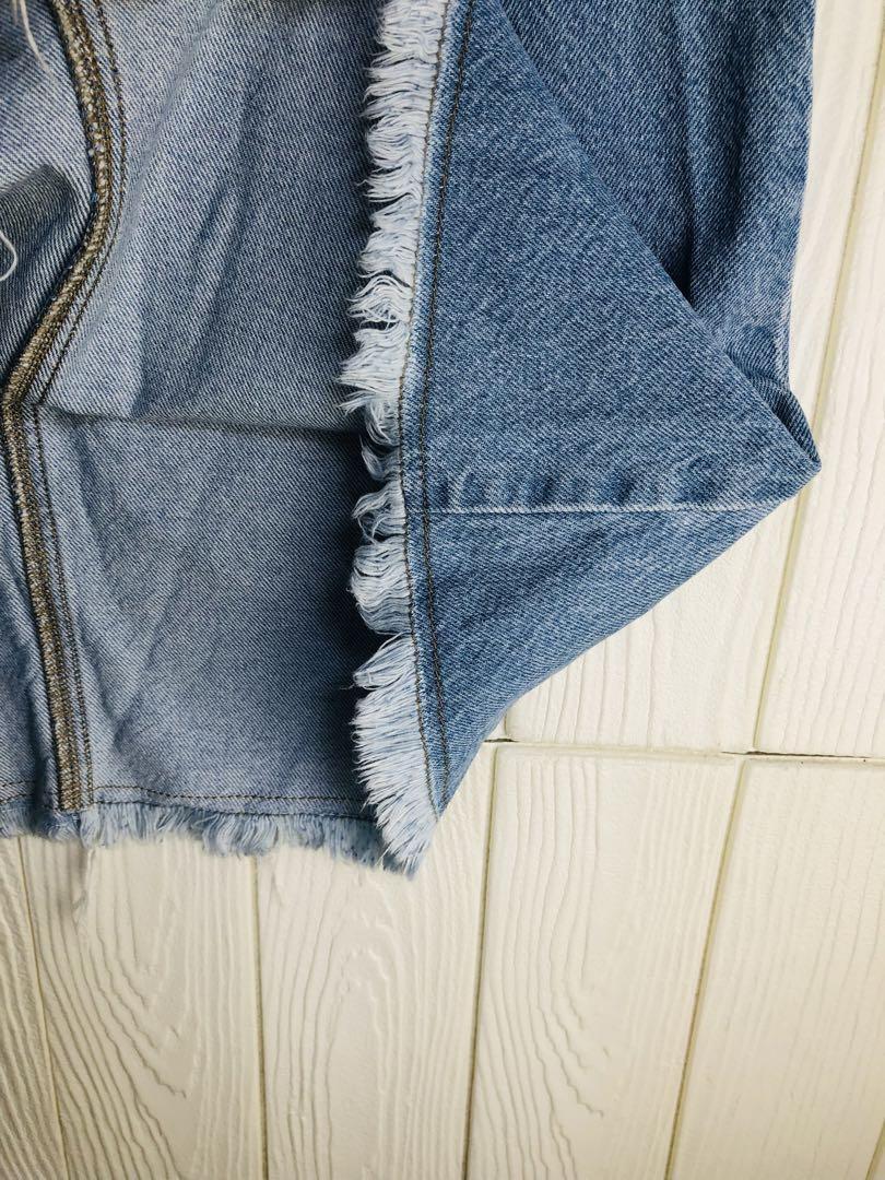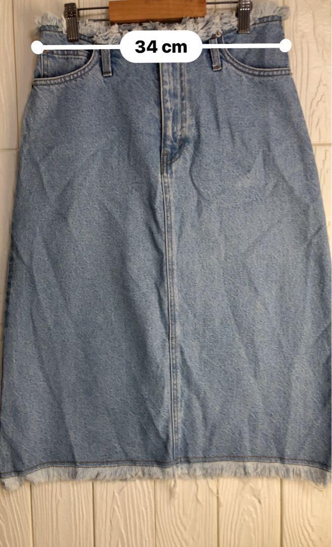 フリンジヘムのライトブルースカート、68 cmのウエストサイズでバックポケット付き。