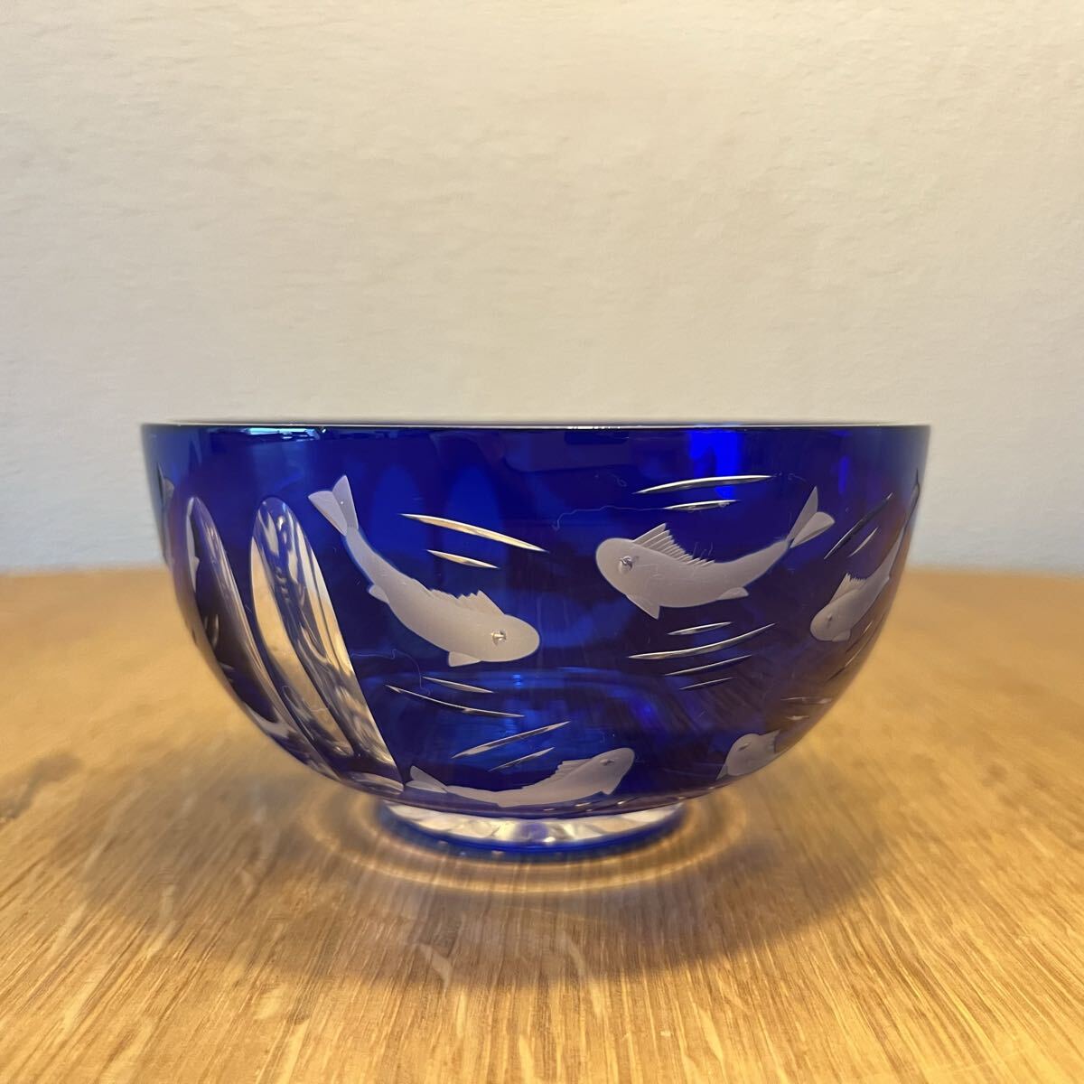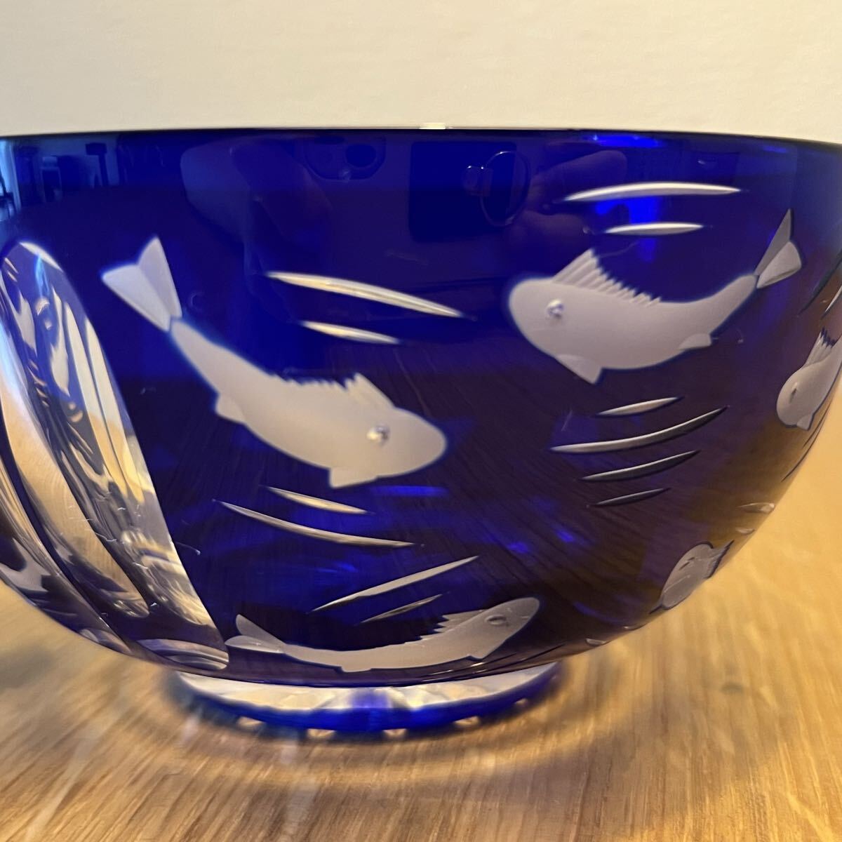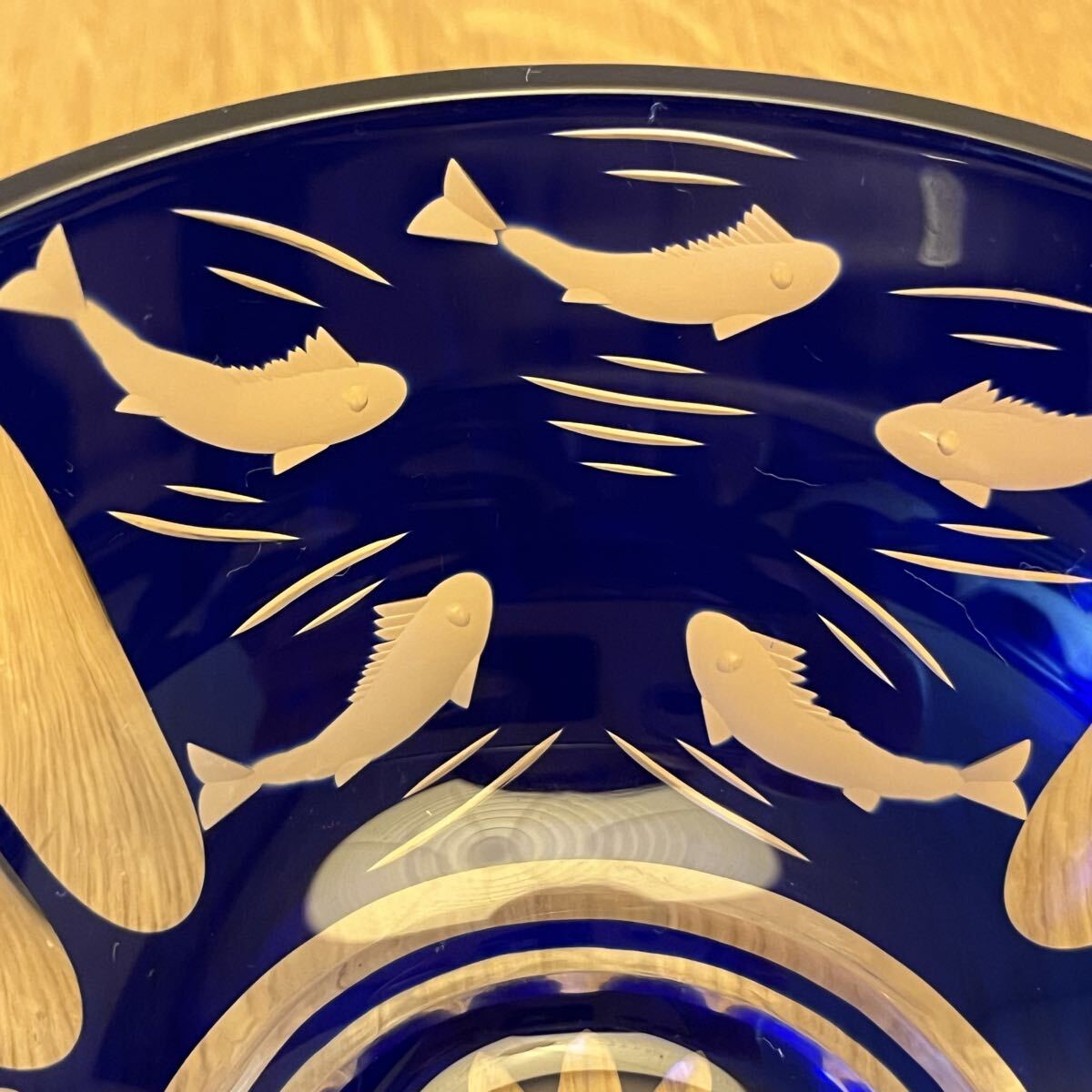 【美品】江戸切子 切子 冷茶碗 丸小鉢 食器 青 ブルー 魚 可愛 ガラス 工芸 切子グラス 硝子 コバルトブルー