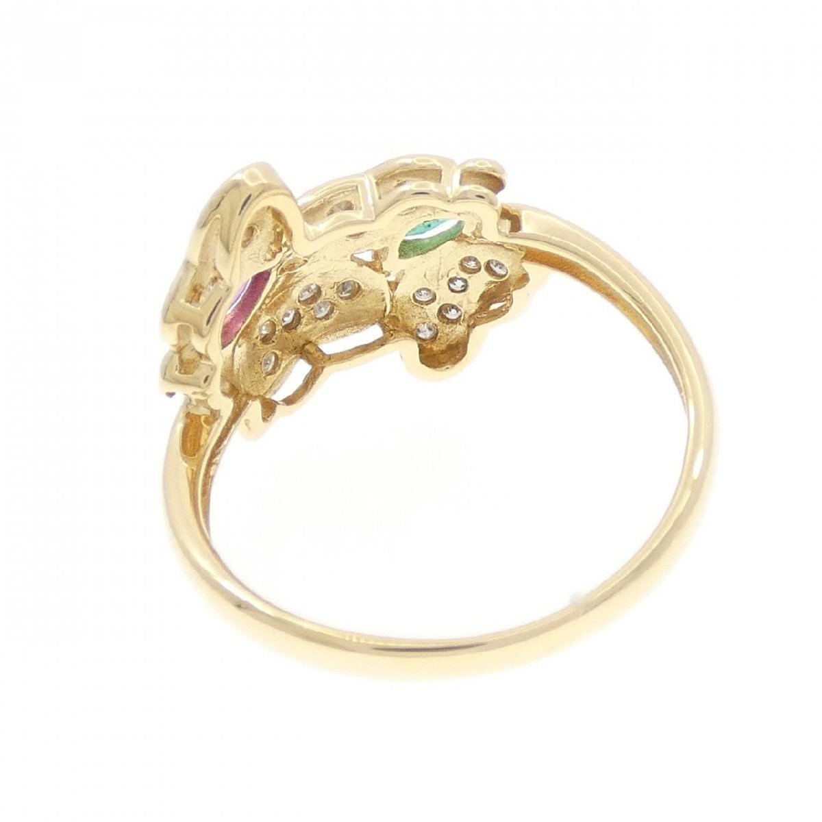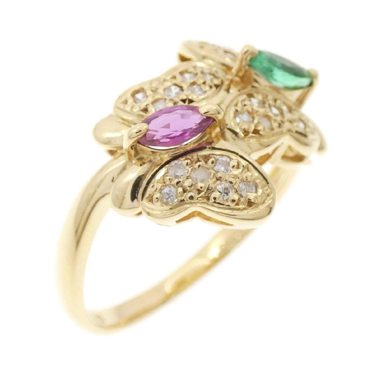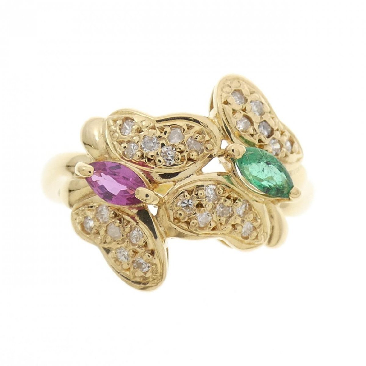 明るいカラーのルビーとエメラルドをセッティング。チョウチョウのデザインが指元を可愛らしく飾るジュエリーです。