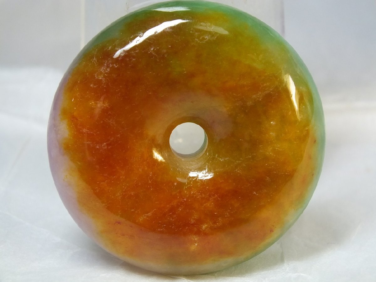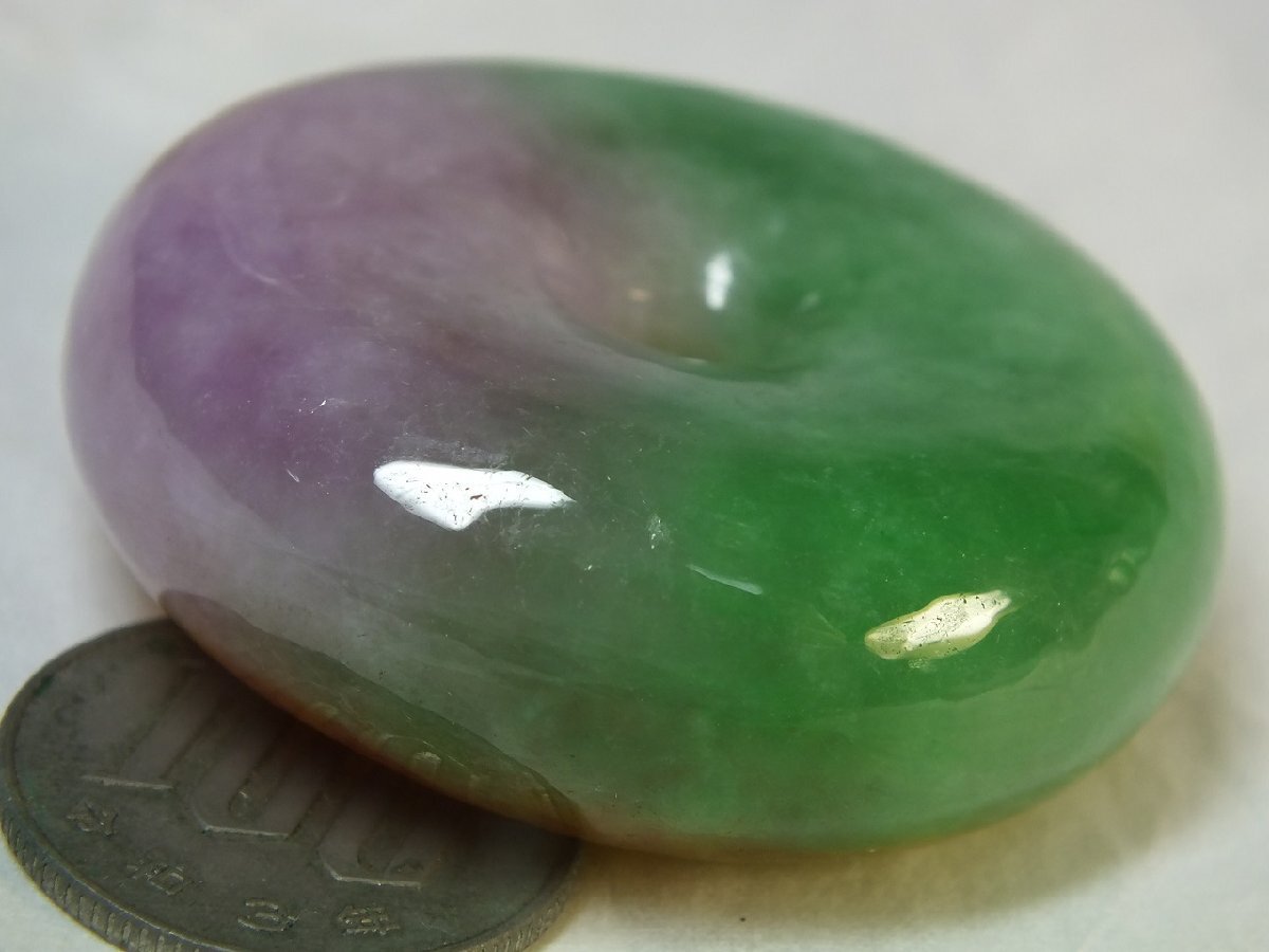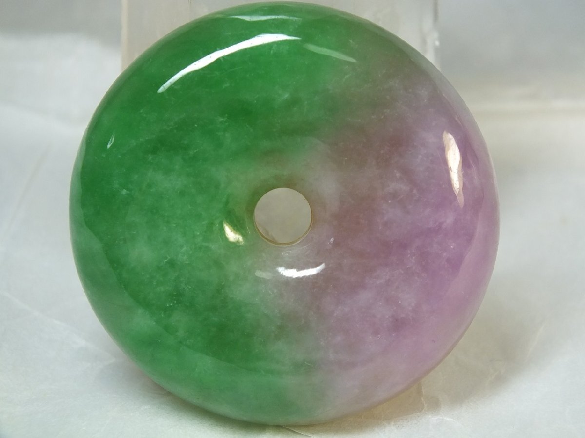 ▲商品説明▲ | サイズ:直径48×厚16mm 重さ:81.4g 緑色が綺麗なミャンマー翡翠。仄かにラベンダー色も混ざった珍品です。中央に直径約6mmの貫通穴が有ります。石コレクションやアクセ作り等に。 ☆商品につきましては注意を払った検品を行っておりますが、稀に石の表面にクラック状の筋や凹みが見受けられる場合が御座います。それは石本来の石紋で傷ではありません(割れが生じ易いヒビではありません)。返品の対象にはなりませんのでその旨御了承の上、ご検討下さい。 |