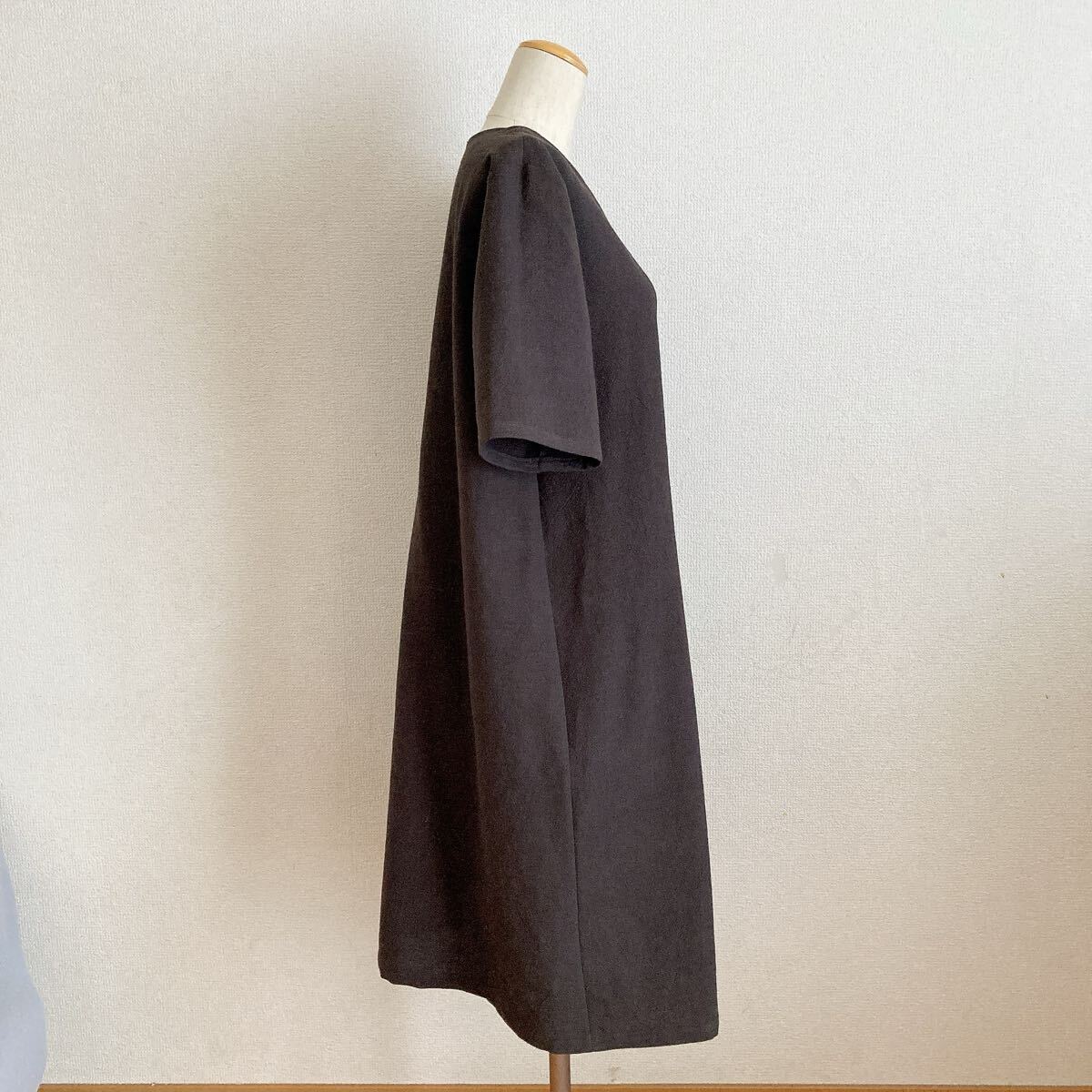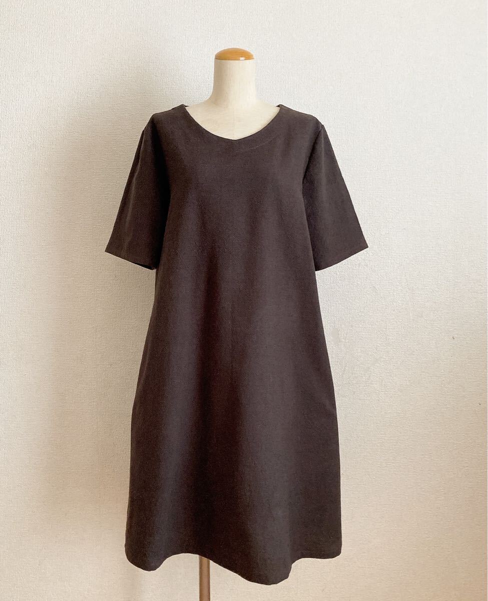Vネックの襟元と少しだけ広がるAラインのシルエットが特徴の、シンプルな5分袖丈ワンピースです。
