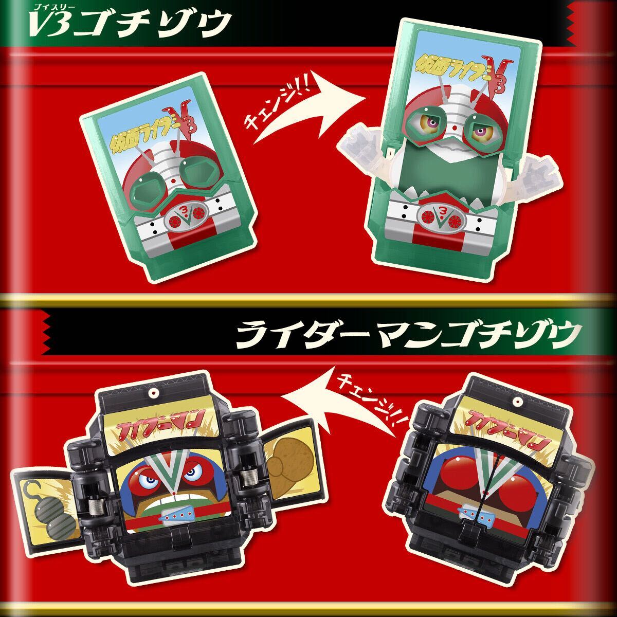「DXレジェンドライダーゴチゾウスペシャルセット-昭和ライダー01-」には、以下の仮面ライダーたちをラインナップし、9種のゴチゾウがセットになっています。