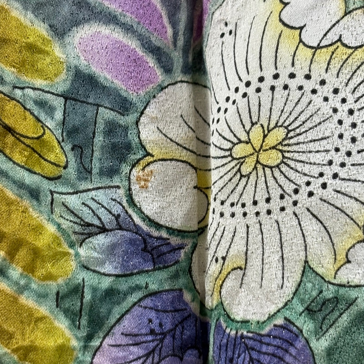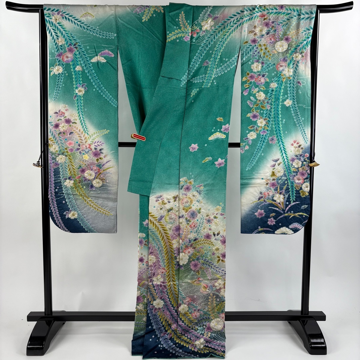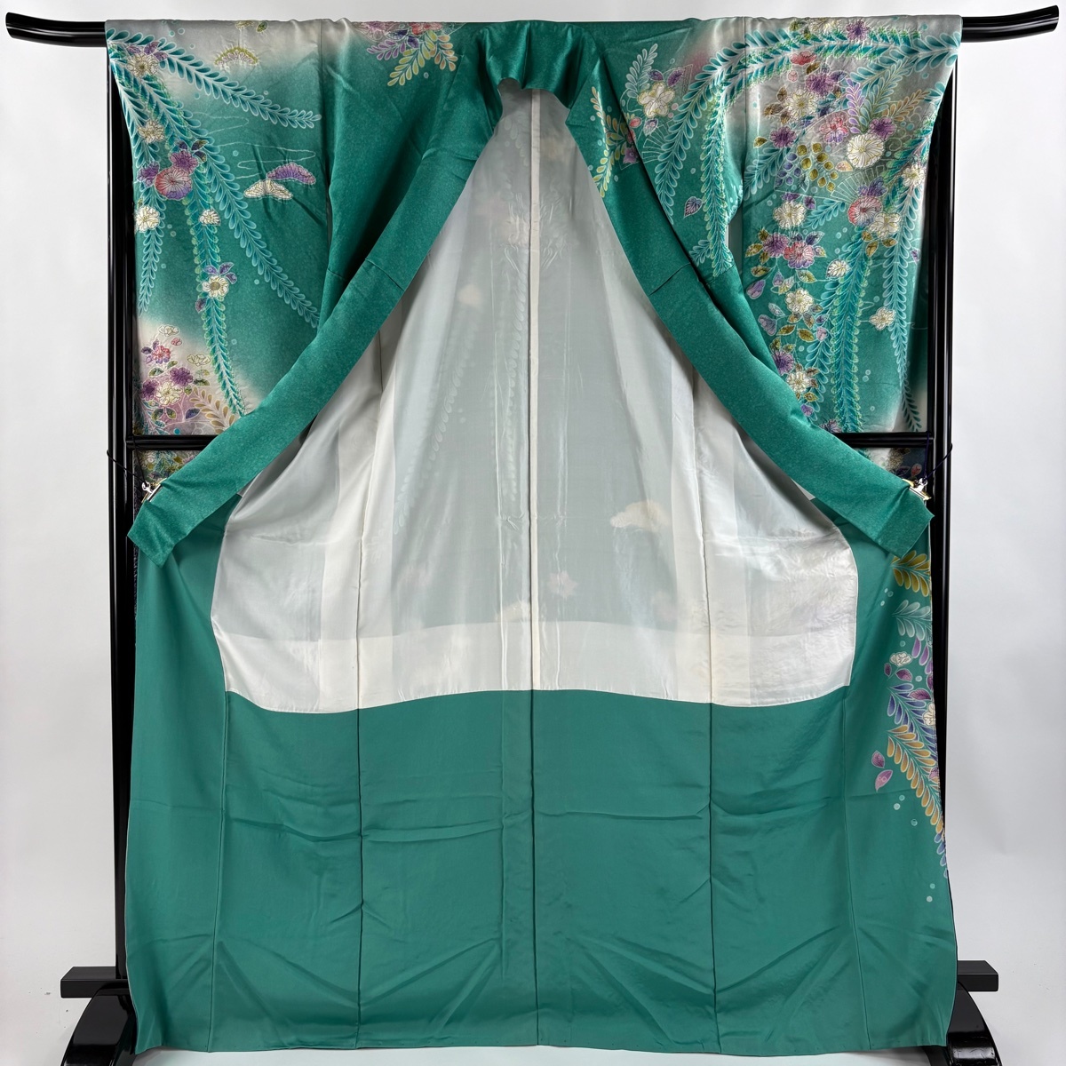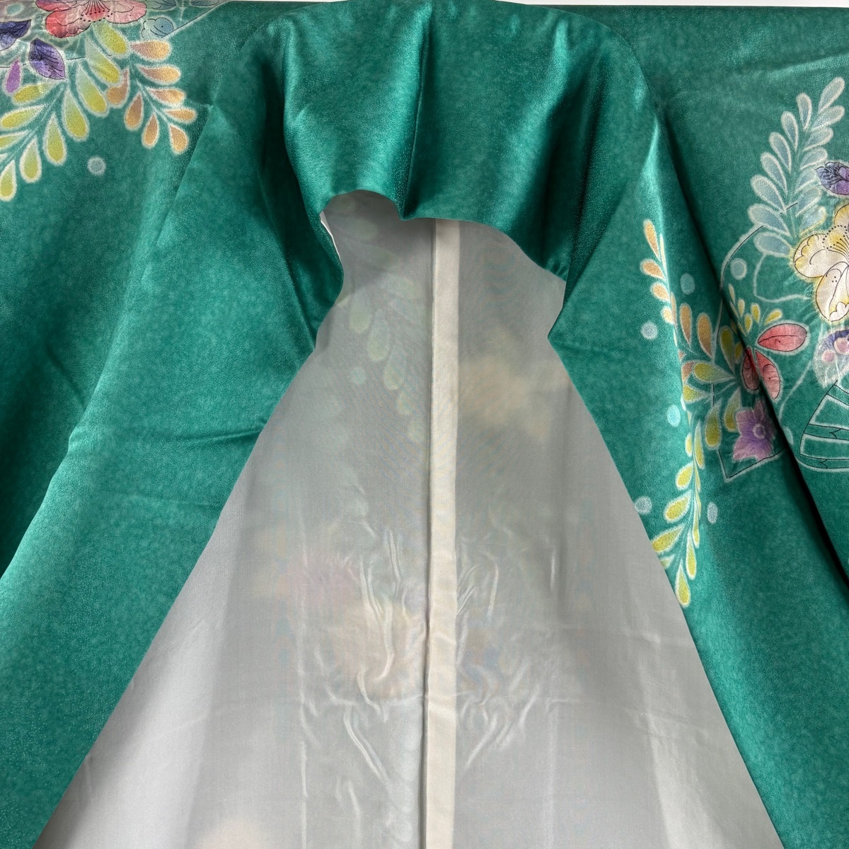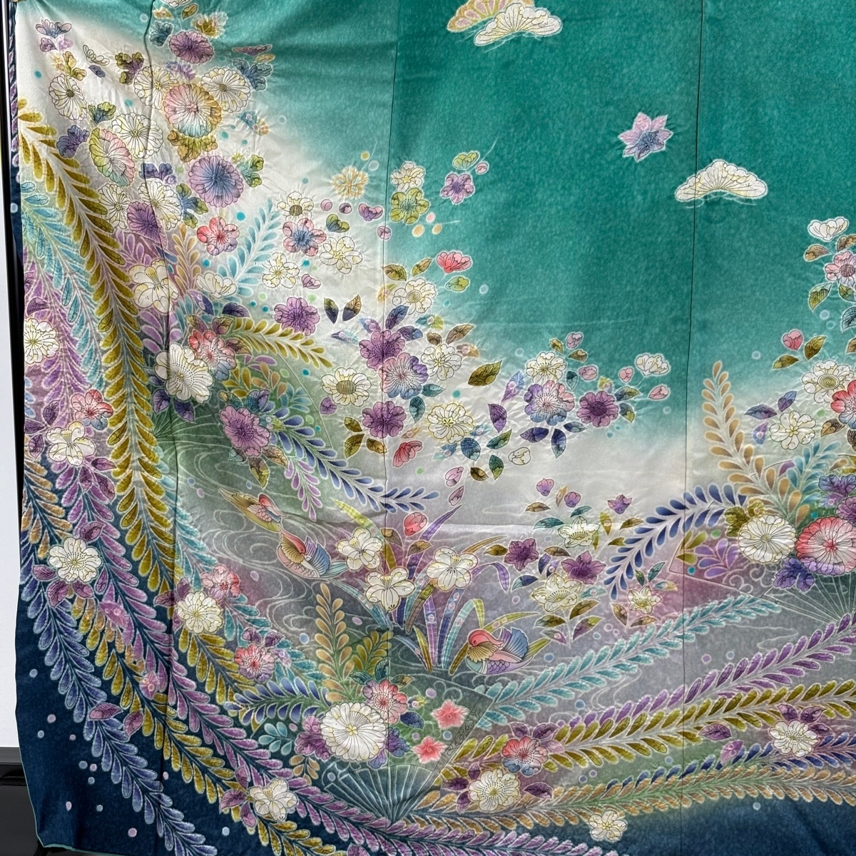 | 振袖 逸品 落款 辻が花 鴛鴦 銀通し ぼかし 緑 袷 身丈171 裄丈67 M 正絹 【中古】 |
