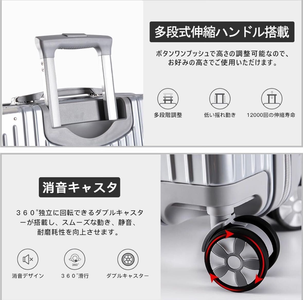 【360°静音キャスター&ターンテーブルロック搭載】高弾性TPE衝撃軽減素材のキャスターを採用し、より静かで耐摩耗性も向上しています。スムーズな滑りを実現しながら、360度の自由回転もできます。暗証番号ロック3桁の暗証番号ロックを採用し、荷物を保護ご。