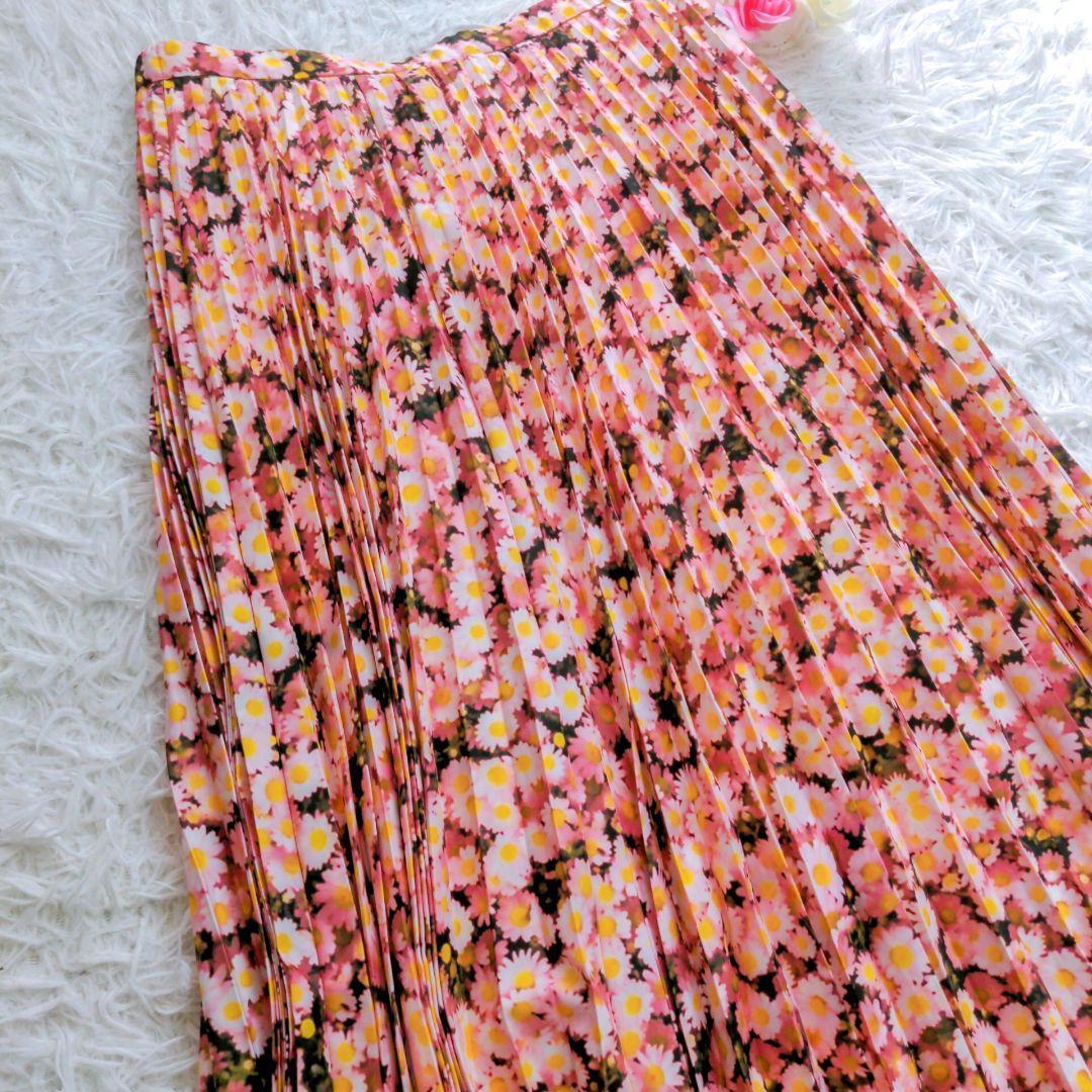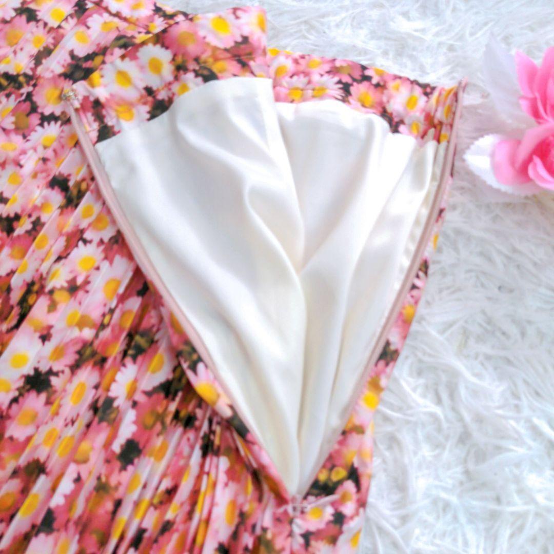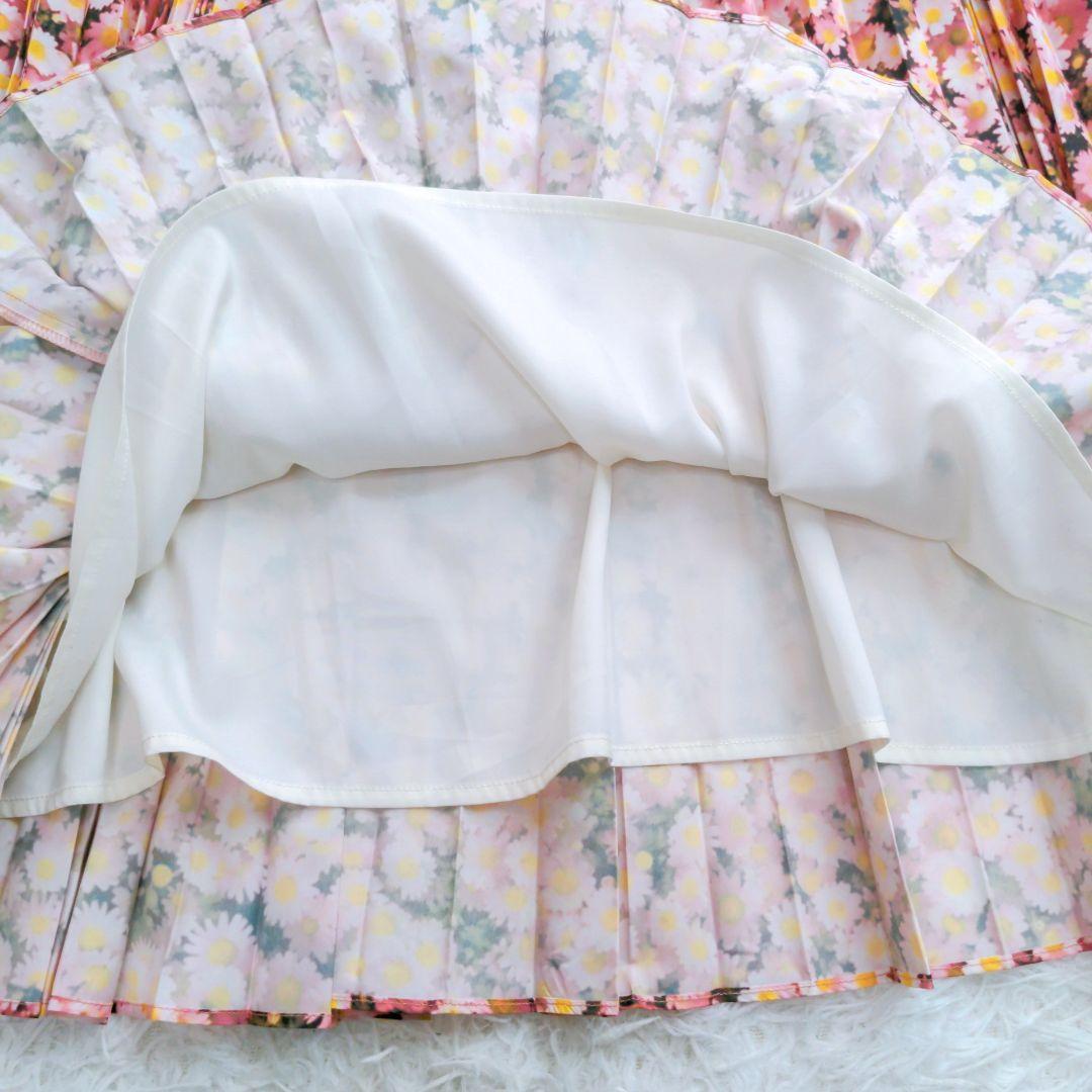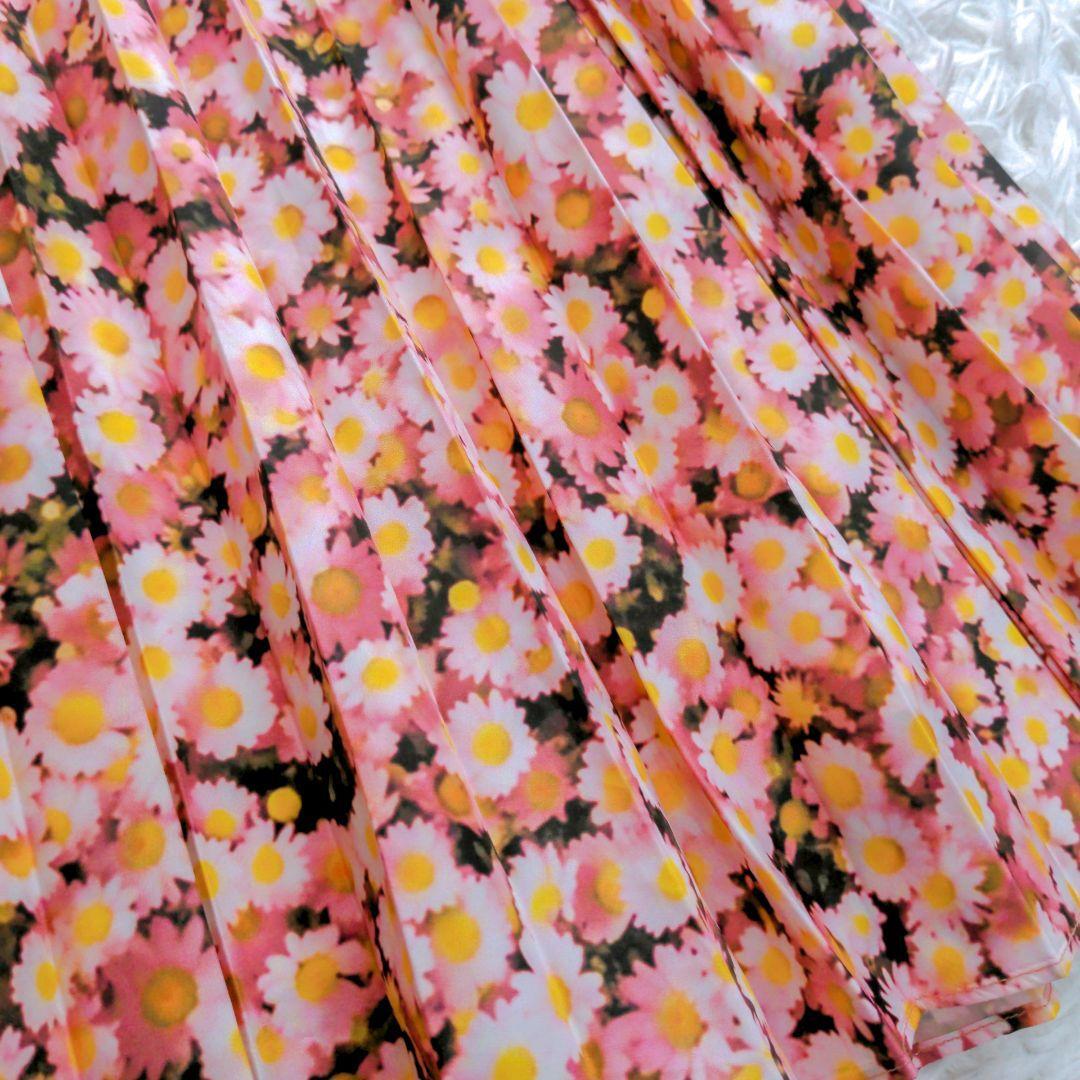 つやのある布帛素材に、色鮮やかな花の風景を切り取った写真を昇華転写プリントしたスカート。