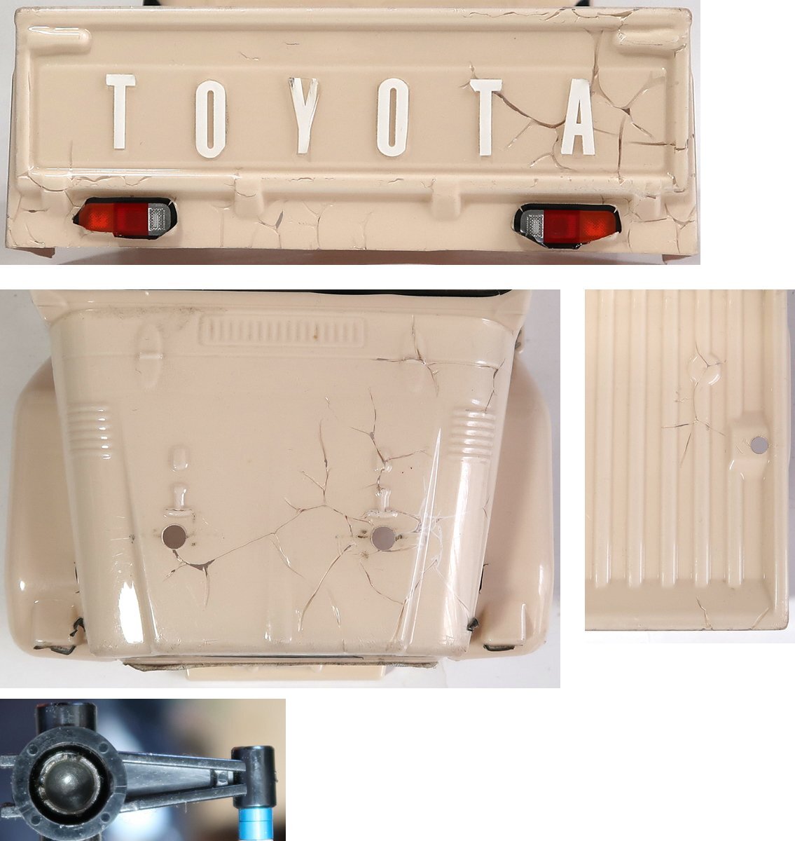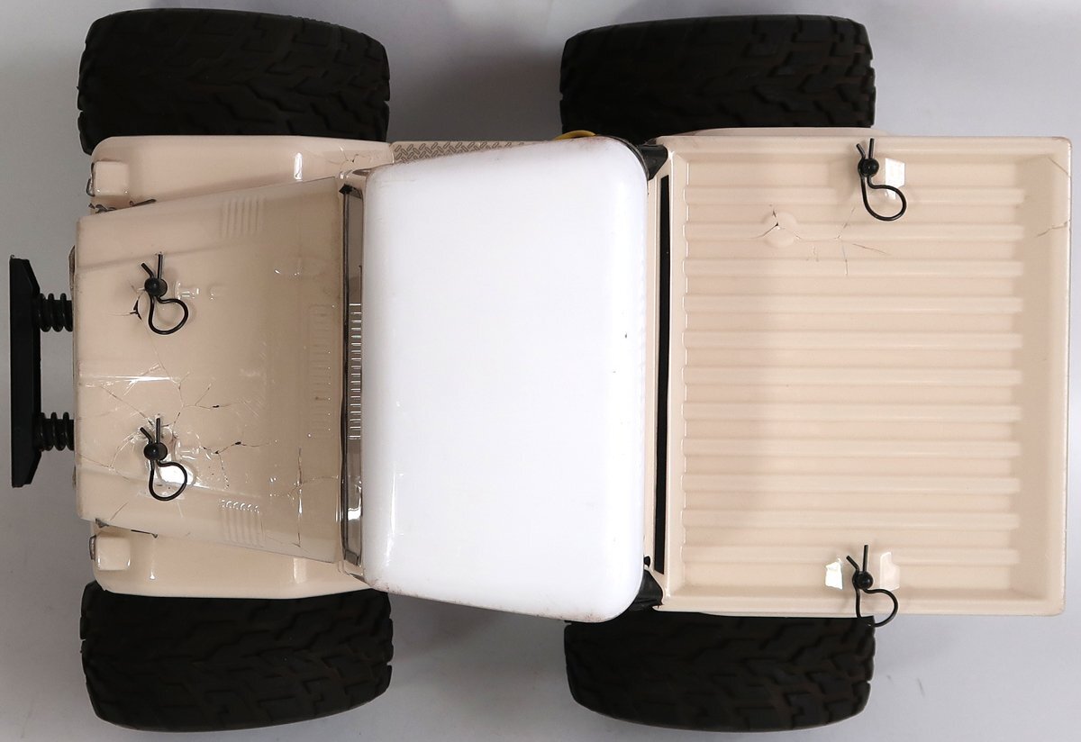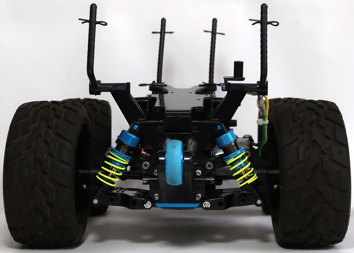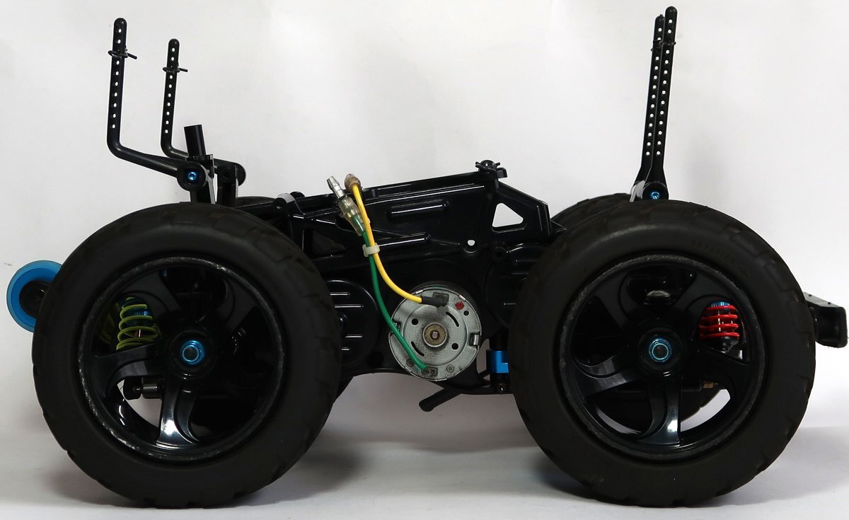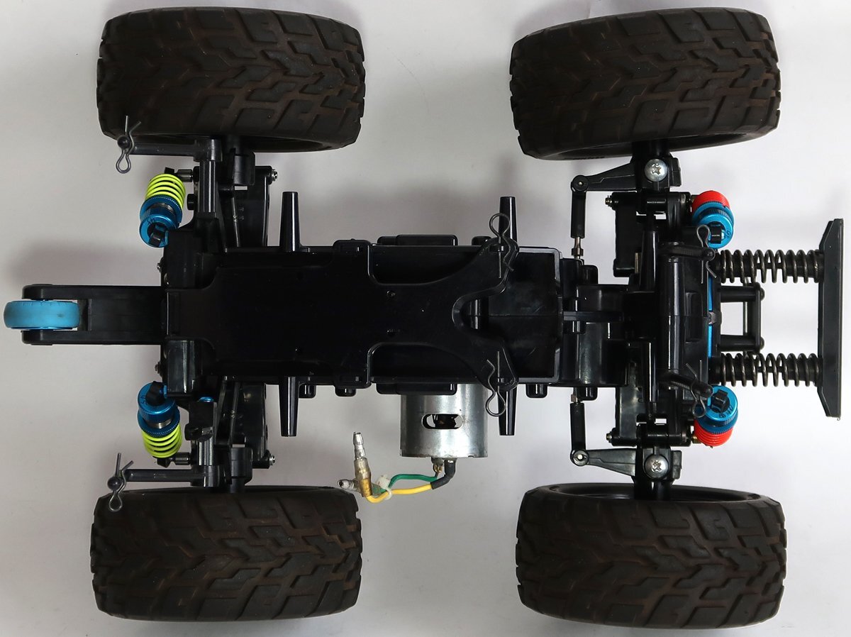 ダンパーやプレートなど多少カスタムパーツが取り付けられています。ベアリングはフロントのみ確認しました。リアは分解するのが面倒なので確認はしてません。出品は画像の本体のみです。動作させる為に必要な物はご自分でご用意ください。右フロントを空転させた時にカラカラ音がするのでネジをとって確認したところ、右フロントのカップジョイントに破損があります。交換が必要です。ステアリングサーボを取り付ける棒状のパーツとそれを取り付けるネジ及びピローボールとサーボホーンがないです。付属ダンパーはおそらくオイルは入っていないか十分でない可能性があります。ダンパーに問題があればご自分でご対処ください。またラジコンは使用品ですので汚れや所々に擦り傷があります。ボディは塗装の剥がれが部分的にあります。裏側のその箇所を擦れば剥がれてきます。説明以外にももしかしたら不足品が有るかもしれませんので画像をよくご覧ください。また走行させる為には必要なパーツや細かいメンテナンスは必要かと思います。その他に私が見る限りは特にひどいダメージは確認出来ませんでした。分かる事は以上です。お取り引き後に説明以外の不足品や説明以外の破損や故障が有ったとしても返品は出来ませんしクレームもお受けできません。いかなる理由がありましても返品はできませんので返品やクレームをしない方のみご入札可能です。