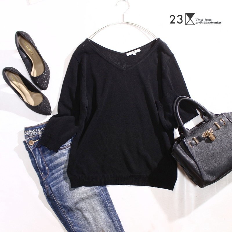 23区 株) オンワード樫山 大きいサイズ44 8分袖 シンプル コットン アクリル Vネック ニットカットソー 15号 ブラック 黒 ミセス 無地 秋