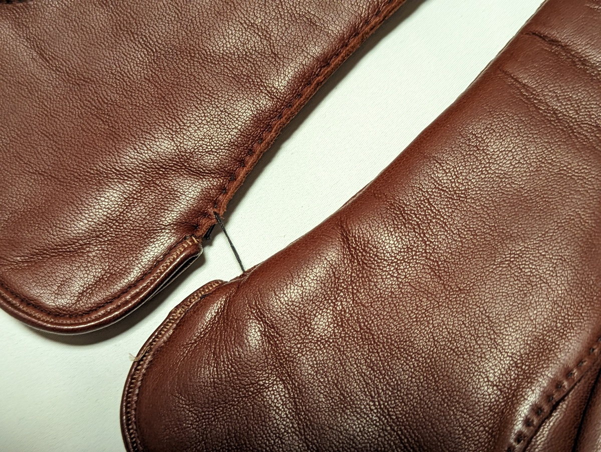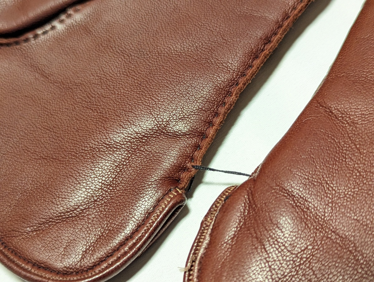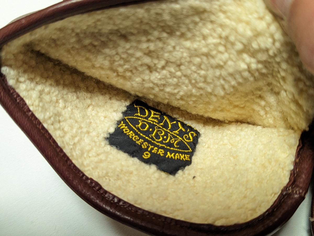 極めて端正な手縫い仕立てで、上質揃いの英国ヴィンテージのなかでもかなりの当たり個体です。英国ヴィンテージでのみ見られる革質です。ほんのり赤紫がかったかなりしっかりとしたブラウンのレザー、決して硬くはなく、もちもちとしていてオイリーな魅力的な質感。裏地はシープのボアです。