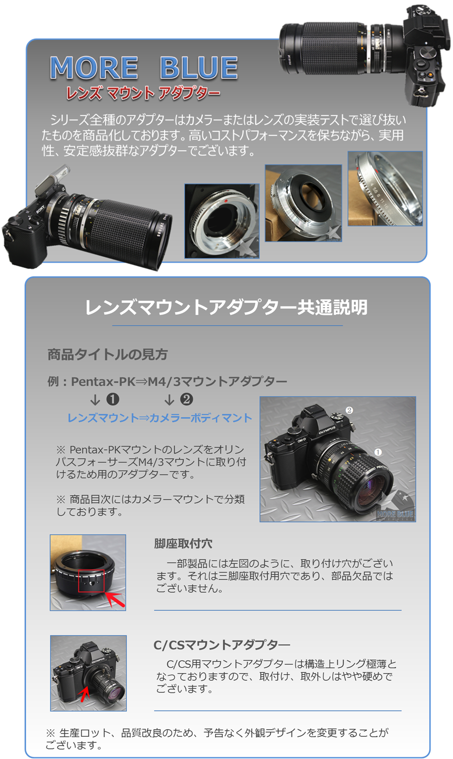 | ・三脚/ピラー | ・電源アダプタ/ケーブル類 | ・メタルレンズフード | |