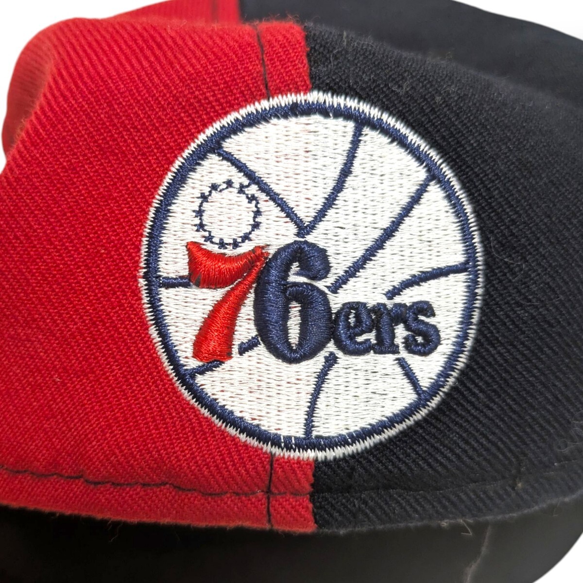 Classic red and navy 2-tone design with bold embroidered NBA and 76ers logos.