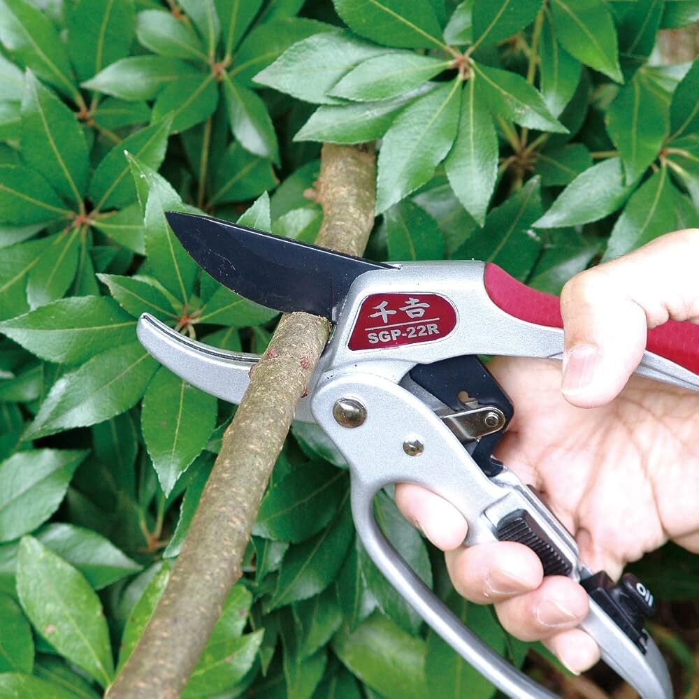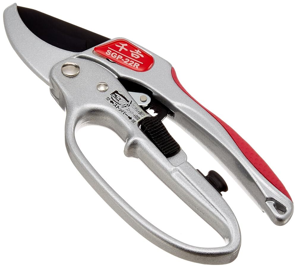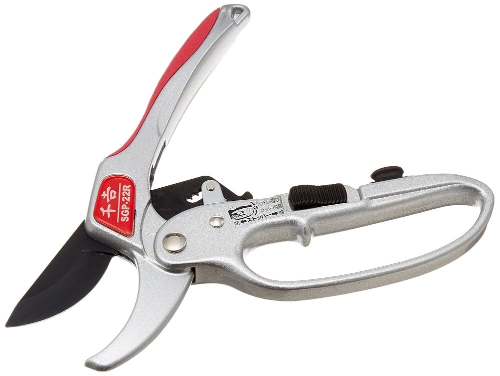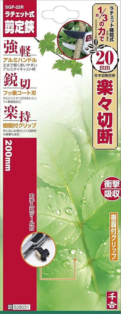 「商品情報」「主な仕様」【用途】剪定鋏。【特徴・機能】剪定・整枝作業用。ラチェット機構で作業楽々。軽量・丈夫なアルミボディ。生木切断能力:20mm。
