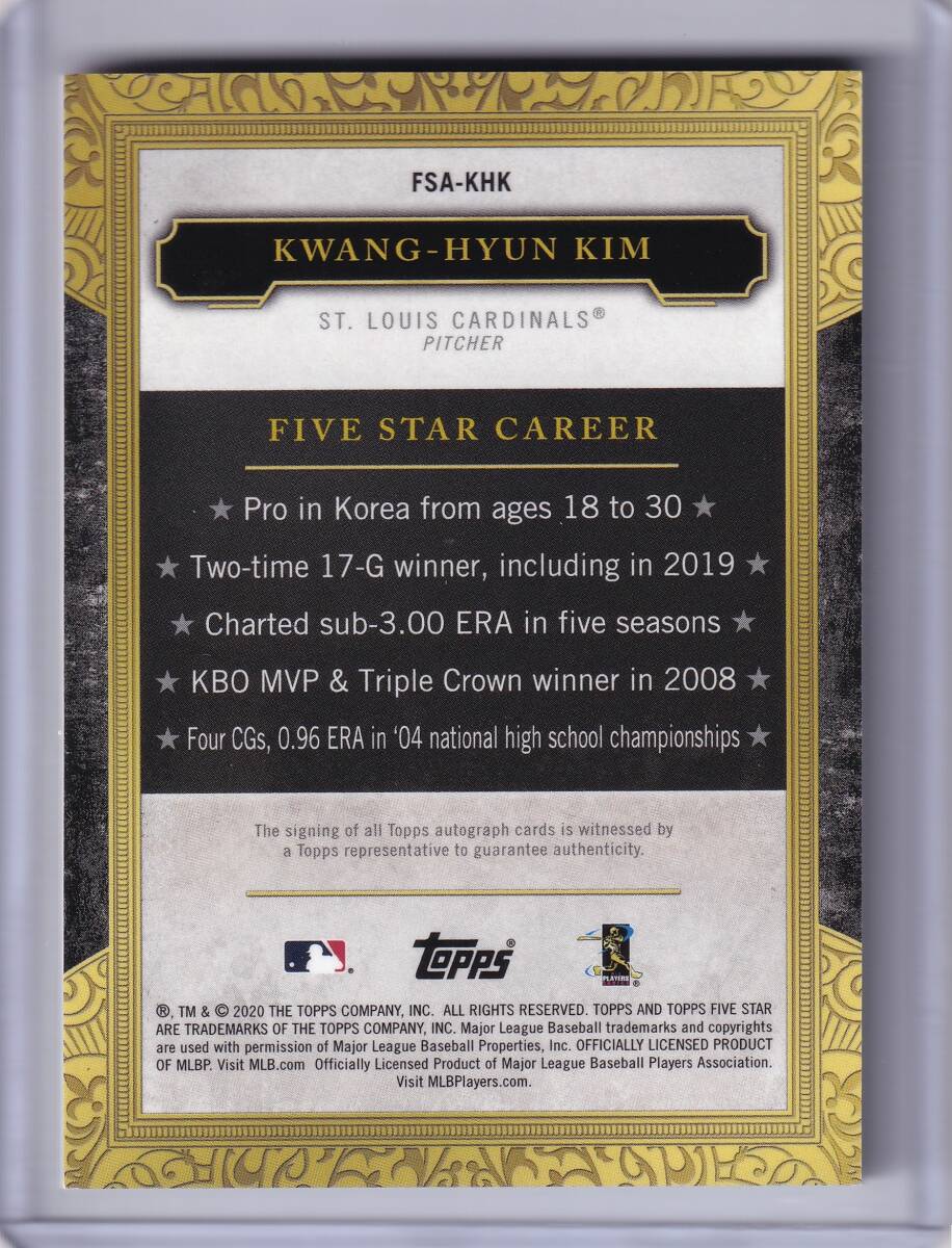 【RC】金廣鉉 KWANG-HYUN KIM 直筆サインカード 15枚限定 2020 TOPPS FIVE STAR ROOKIE AUTOGRAPH CARD / キムグァンヒョン / 直書き AUTO