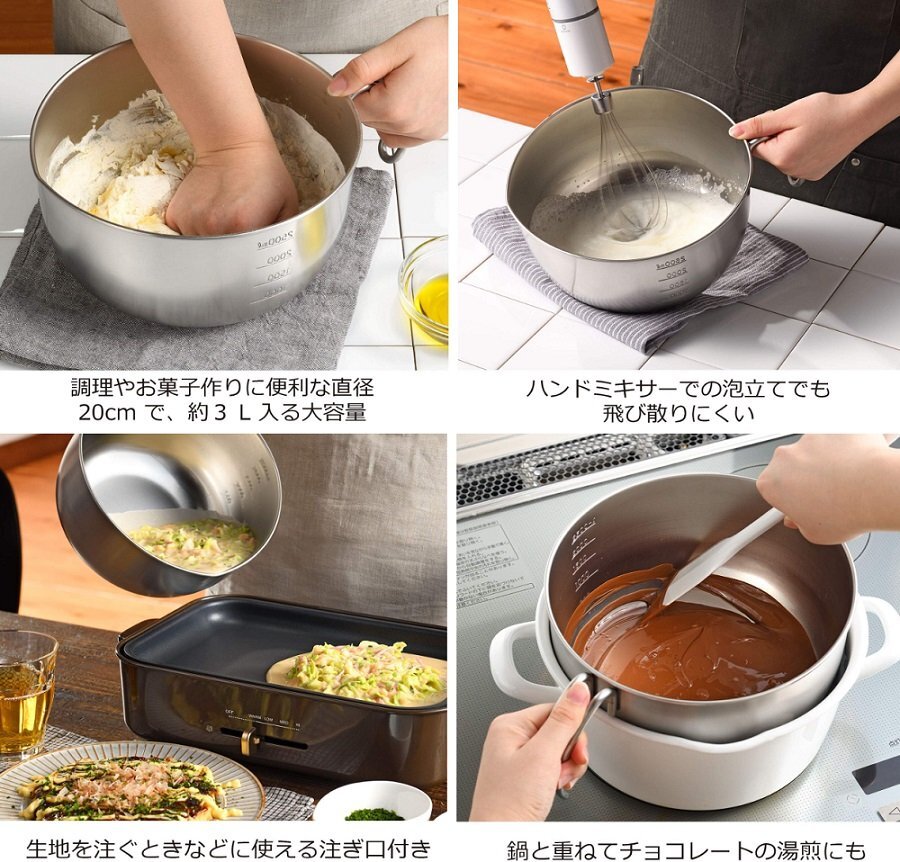 持ちやすさにこだわった取っ手付きのボウルで、混ぜる、こねる、注ぐなどが楽になります。 |