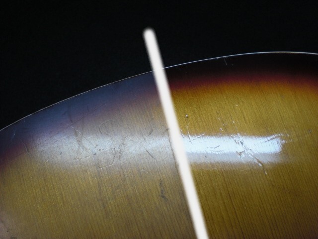 入手時から有った高音側ショルダー辺りの微細な塗装チップと、サウンドホール付近に小さなシール跡?以外に目立つ様な傷は殆ど有りません(写真参照)