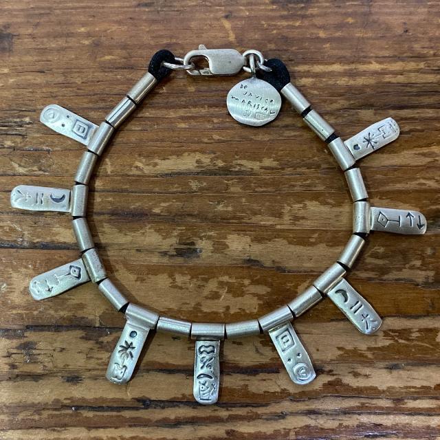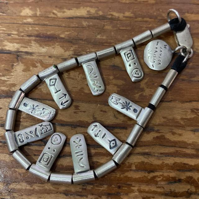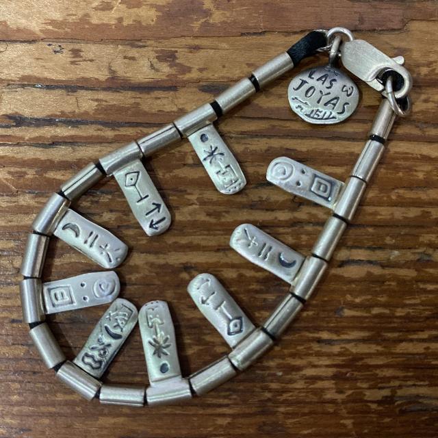 【JAVIER MARISCAL(ハビエル・マリスカル)」がデザインし、1998年にJuan Valera Joyeros(フアン・ヴァレラ・ジョイェロス)が製造したブレスレットです。マリスカルらしい可愛らしいイラストが刻まれた楽しいシルバー製のブレスレットです。一見大人っぽいデザインですが、よく見ると笑っちゃうような大人の遊び心満載といった感じの持っているだけでも楽しい作品です。インディアンジュエリーやメキシカンジュエリーのような感覚でお使い頂けると思います。マリスカルのアクセサリーは滅多に出てこないと思います。お探しの方、是非…!】