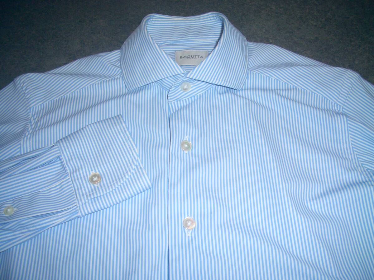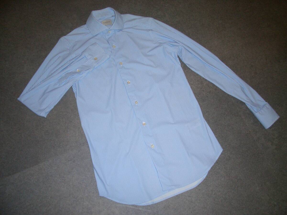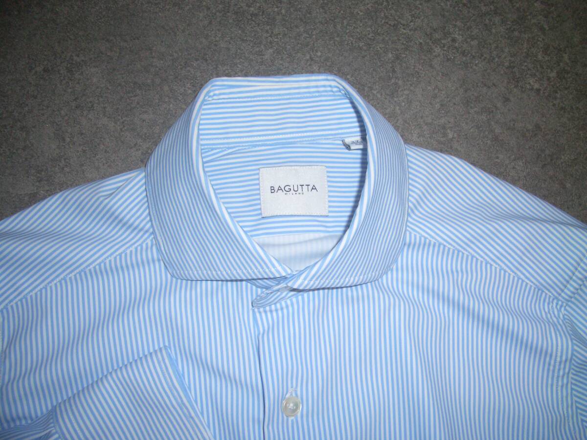 32000円 BAGUTTA ジャージシャツ 水色×ホワイトストライプストレッチシャツ イタリアンカラー超ワイドカラー襟高 長袖シャツ 37 バグッタ