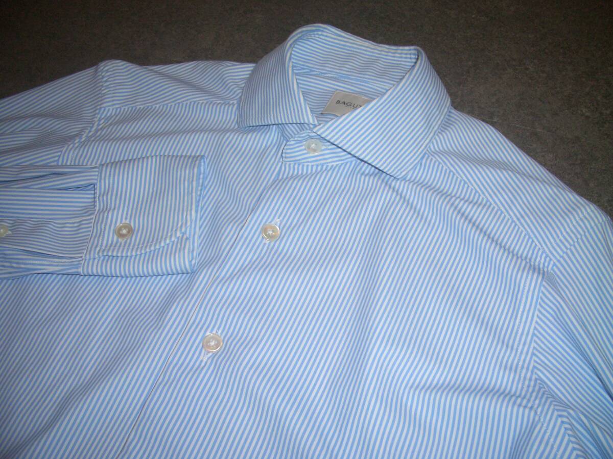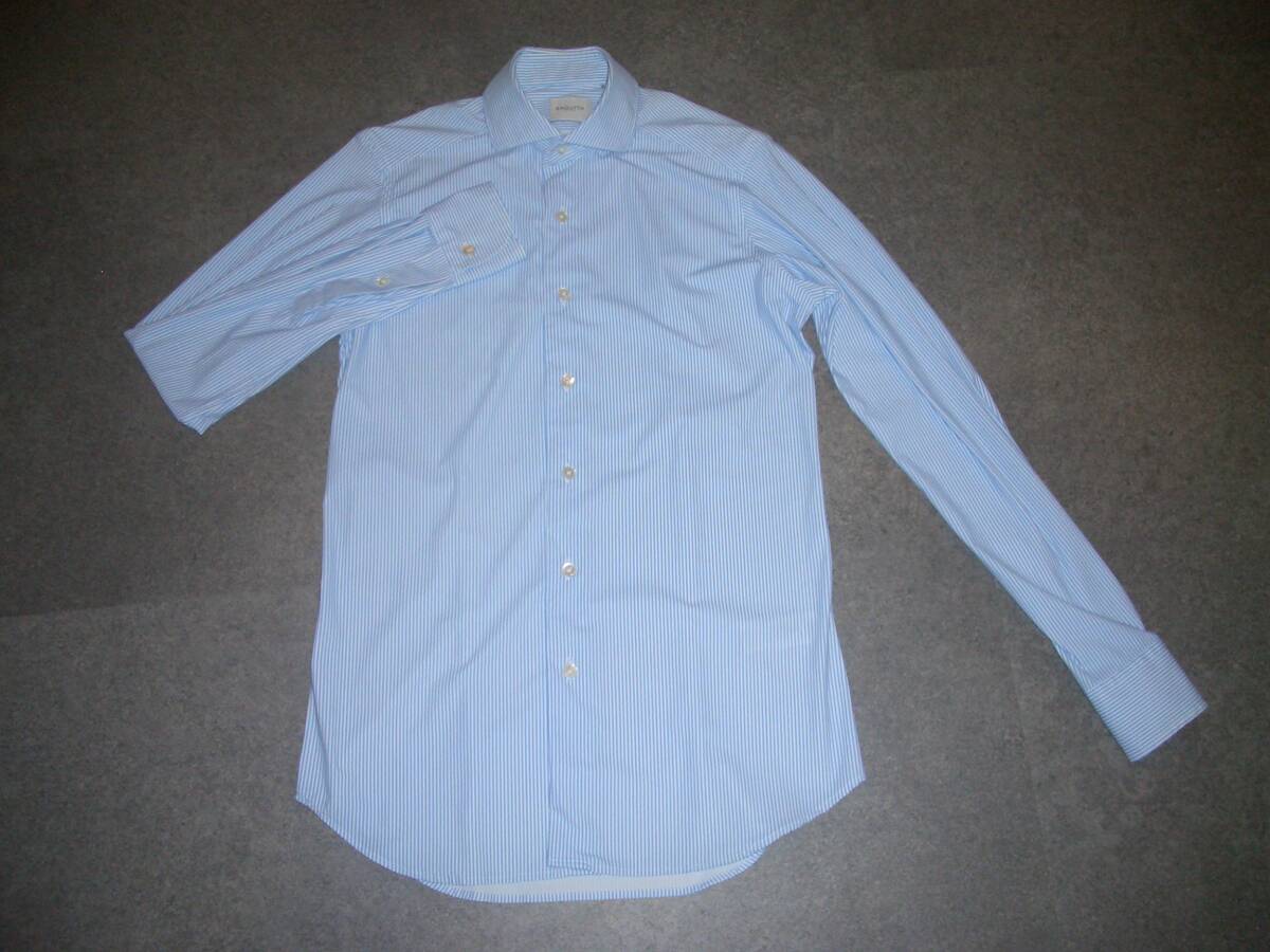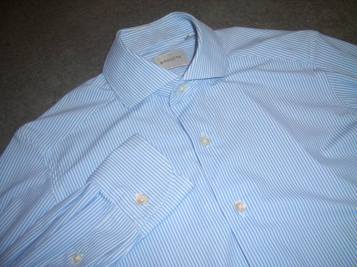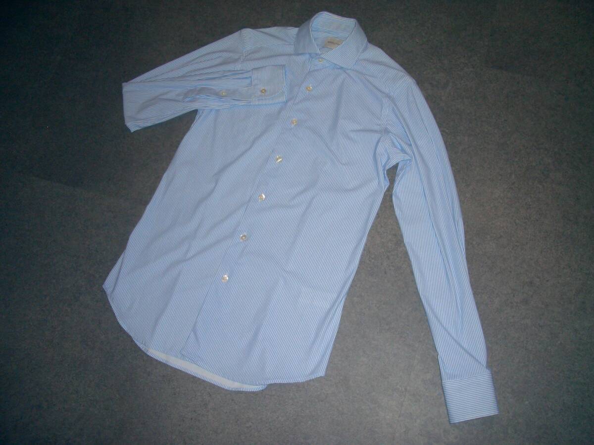 32000円 BAGUTTA ジャージシャツ 水色×ホワイトストライプストレッチシャツ イタリアンカラー超ワイドカラー襟高 長袖シャツ 37 バグッタ