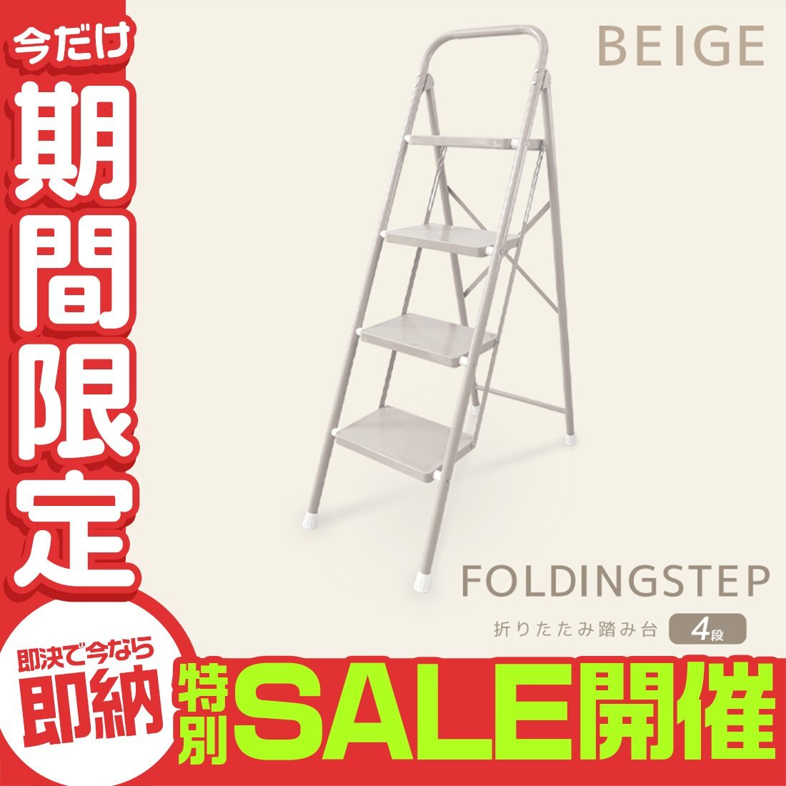 ステップ台 4段脚立 (折りたたみステップ 滑り止め加工) 耐荷重(約): 150kg 段数: 4段タイプ カラー: ベージュ 暮らしに馴染むやさしいカラーの折りたたみステップです。 一家に一台あると便利! 照明器具の交換や、高い位置になる棚から物を取り出すときに便利!! 耐荷重(約)150kg&ワイドステップ!安定感抜群で安心♪ また、滑り止め加工・握りやすい持ち手・脚先グリップで最上段まで簡単に上れます! お部屋や玄関に置いても邪魔にならないスリムサイズ。 折りたためばコンパクトに!手軽に持ち運びできちゃいます☆ |