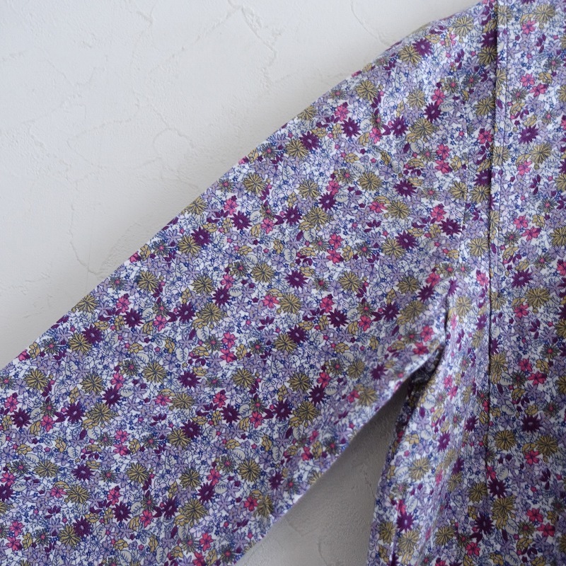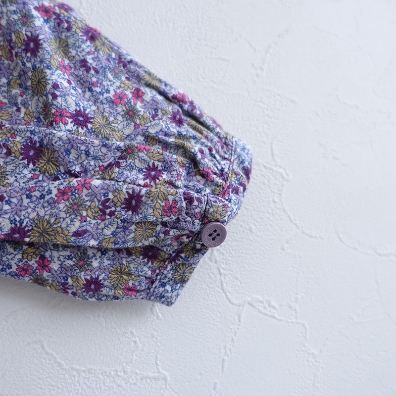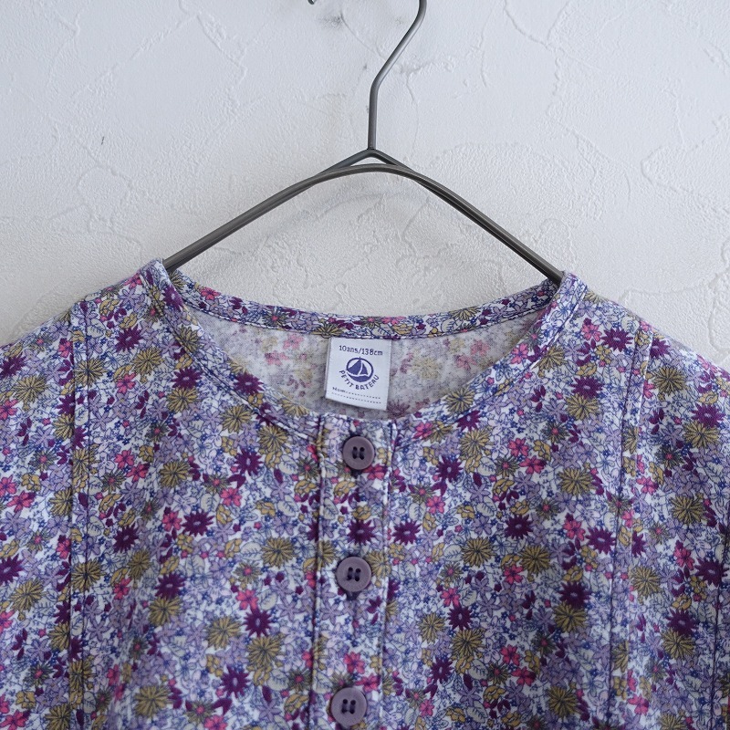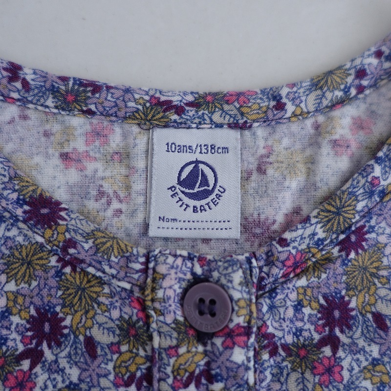 PETIT BATEAUのコットン 花柄 ワンピ―スです。 カラーはホワイトベースにパープル・ライトパープル・ピンク・ウォーカーなどで、花柄プリントのコットン生地で仕立てられております。Aラインシルエットになっており、フロントハーフボタン開閉で着脱でき、フロント両サイドにパッチポケットが付いてたデザインです。 |