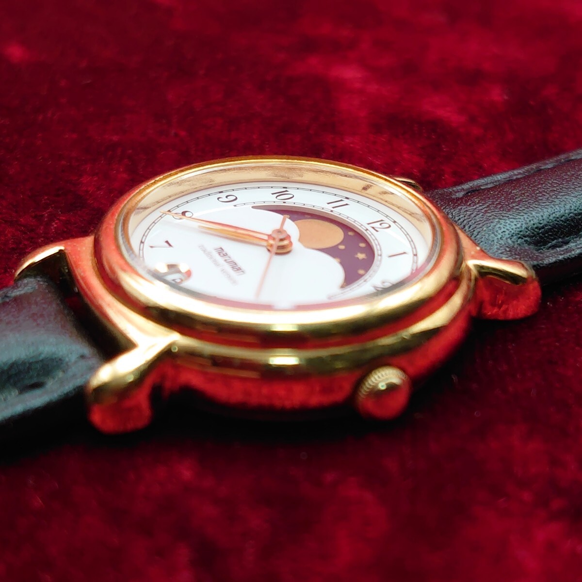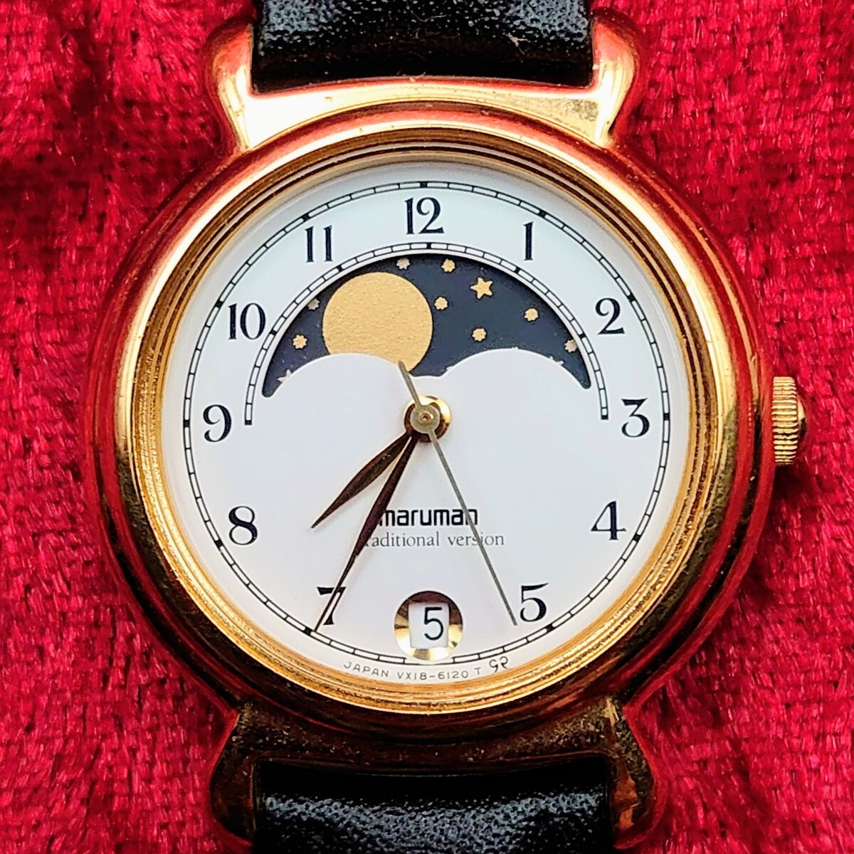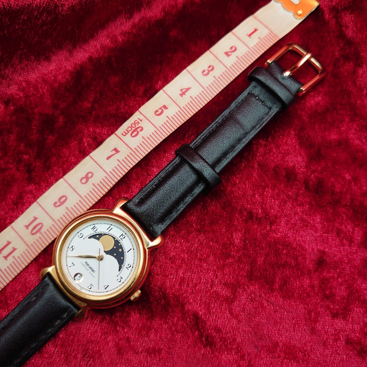 【商品】A09【ベルト新品/電池交換済】 ビンテージ ムーンフェイズ maruman アナログデイト レディース腕時計 MW502 白文字盤×ゴールド