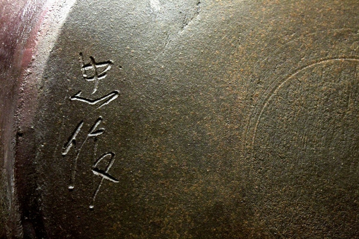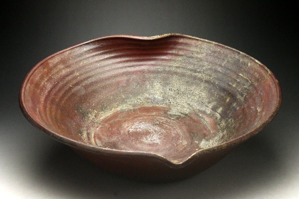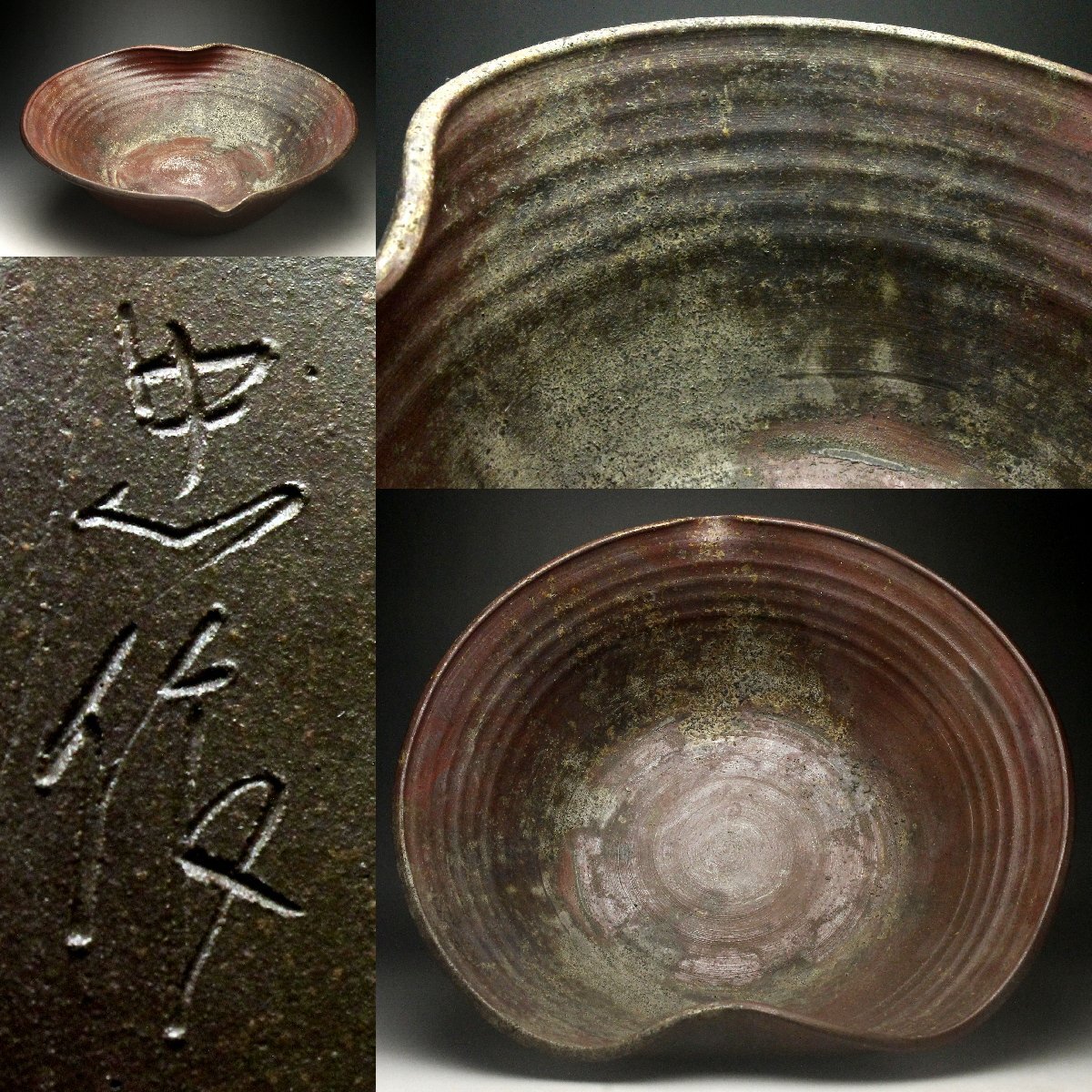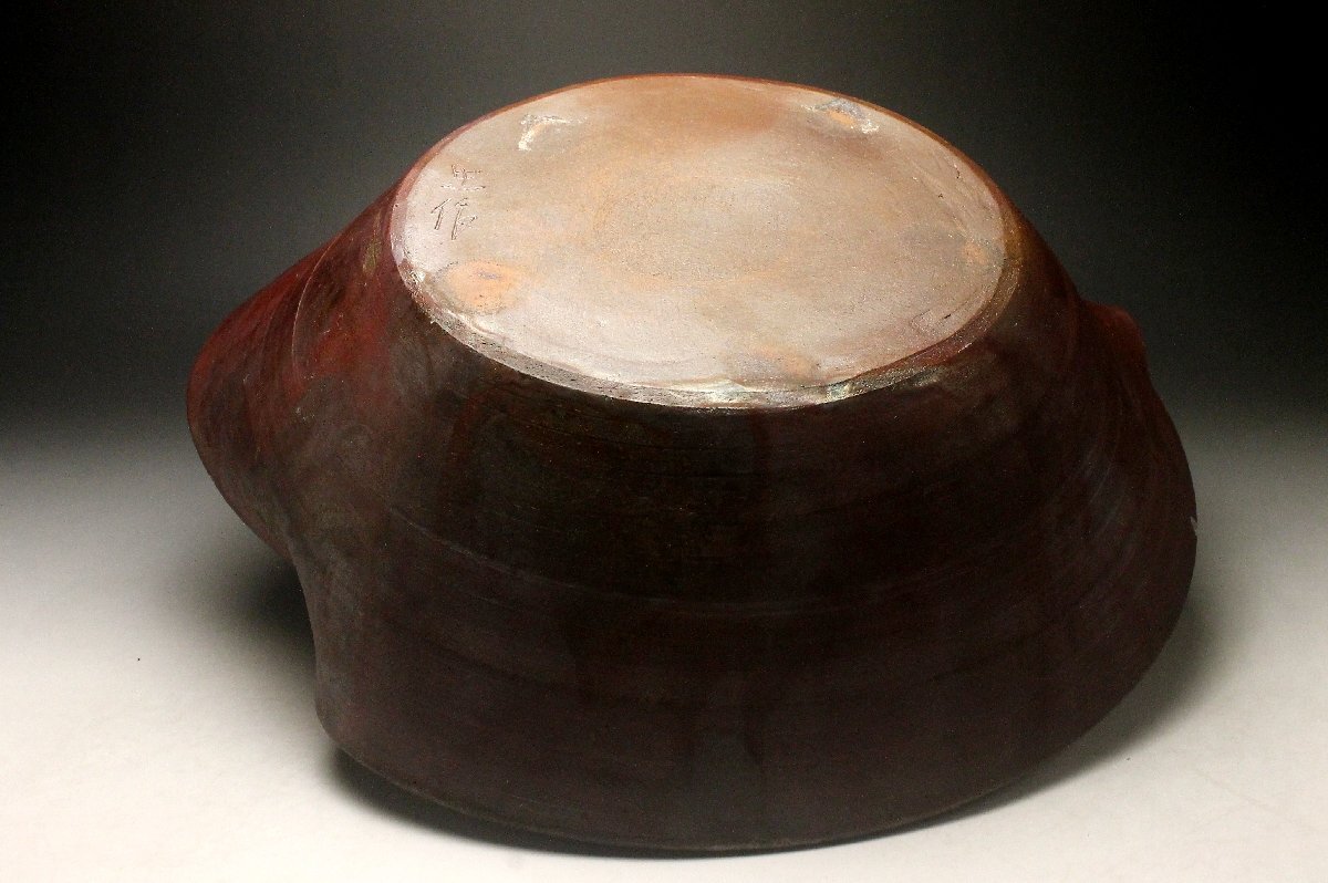 【余韻】 備前焼 忠銘 作家物 陶印在 在銘 花器 桃形 水盤 大鉢★華道具 茶道具 径:34cm 経年保管品 現状品<同梱可>