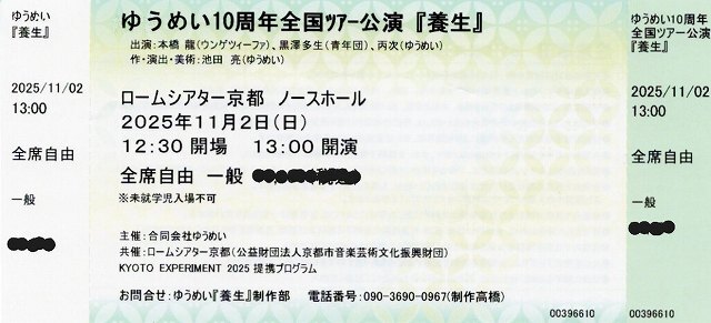 ゆうめい10周年記念公演「養生」のチケットをお譲りします。