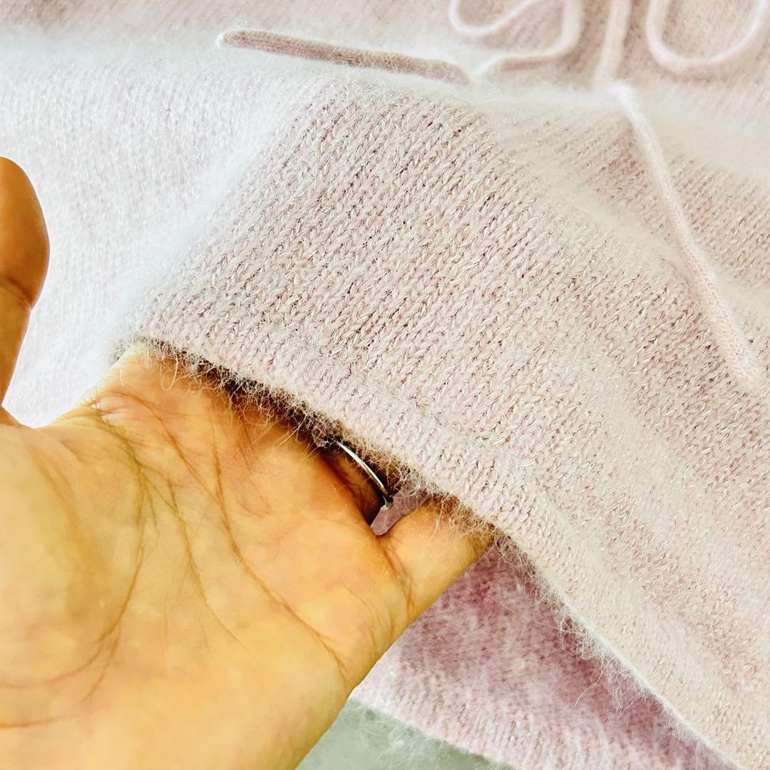 アンゴラ特有のふわふわとした毛足があり、肌触りが柔らかく暖かみのある質感です。軽やかな着心地ながら、見た目も高級感があります。