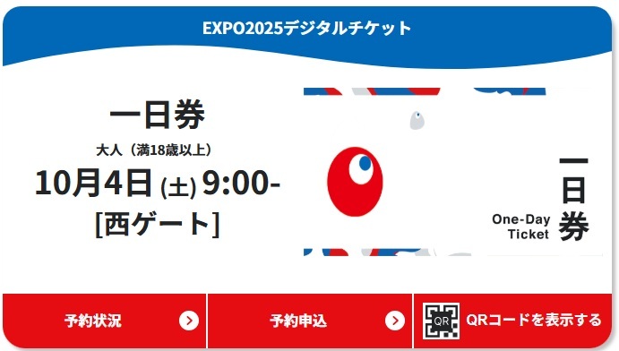 2025大阪・関西万博の10月4日9時入場の予約済みチケット(大人一日券)1枚です。