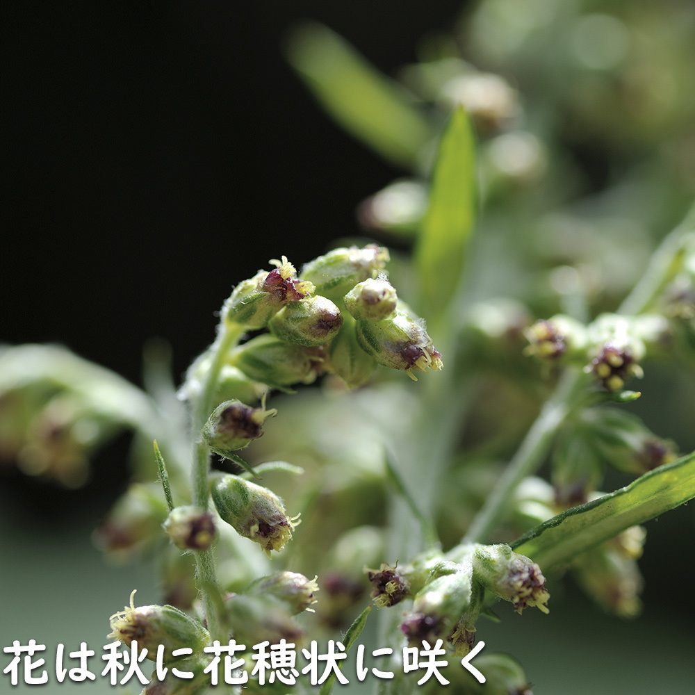 【商品情報】ヨモギは1mになる多年草です。北アジアが原産です。葉は大きく裂け、裏面には白い毛を密生します。花は目立たない花を咲かせます。全国各地の野原や河川の土手などに自生しています。夏から秋に黄色い花粉を付けた小花を咲かせます。晩秋に茎葉が枯れて地下茎の先に別の葉をつくり、その状態で冬を越します。裏は綿毛が密生して灰色に見えます。この綿毛を集めたものがお灸に使われるモグサになります。3~5月の若い芽は草餅に使われ、刈り取って乾燥させたものは漢方薬に用いられます。茎葉に芳香があり、ハーブや薬として利用されるものも多いです。