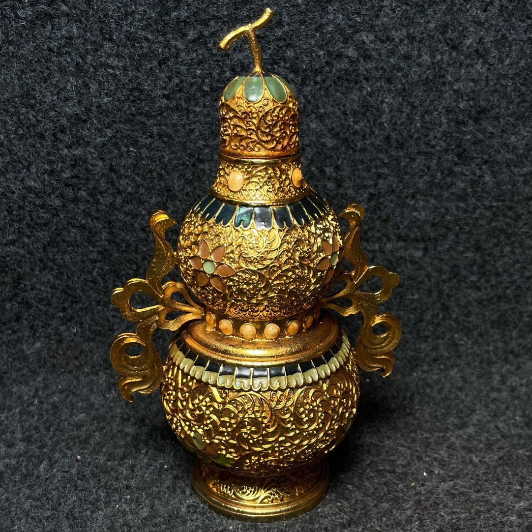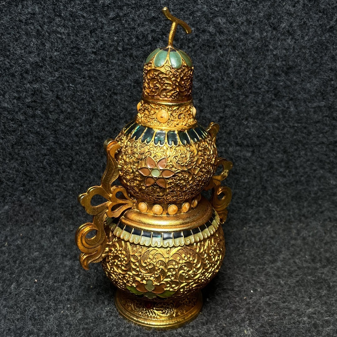 【超珍館蔵】銅製細作 塗金 福壽如意 ひょうたん一對 箱付 擺件 古賞物 古董品 古美術品 時代物 旧家蔵出 稀少珍蔵品
