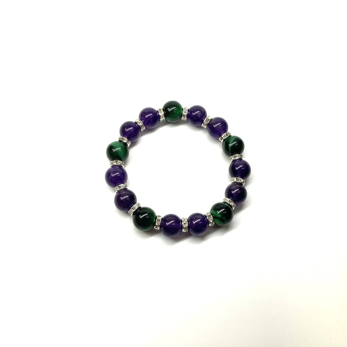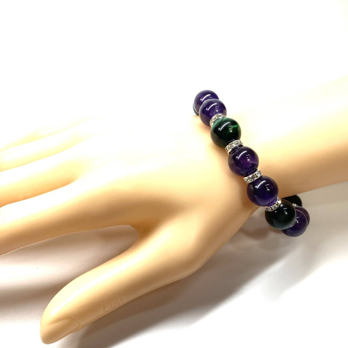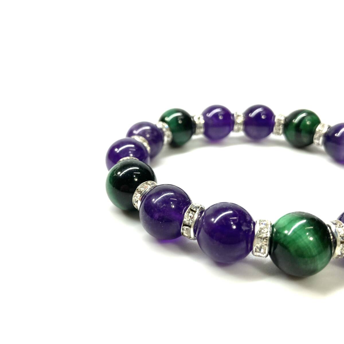 こちらは、グリーンタイガーアイとアメジストを組み合わせたパワーストーンブレスレットです。間にはロンデルを挟み高級感あるデザインに仕上げております。石大きさは12mm玉を使用して内周約18cmです。気になる方は是非この機会にどうぞ。