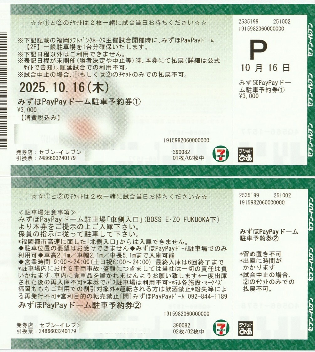 10月16日(木)のみずほPayPayドームの駐車場の駐車券です。