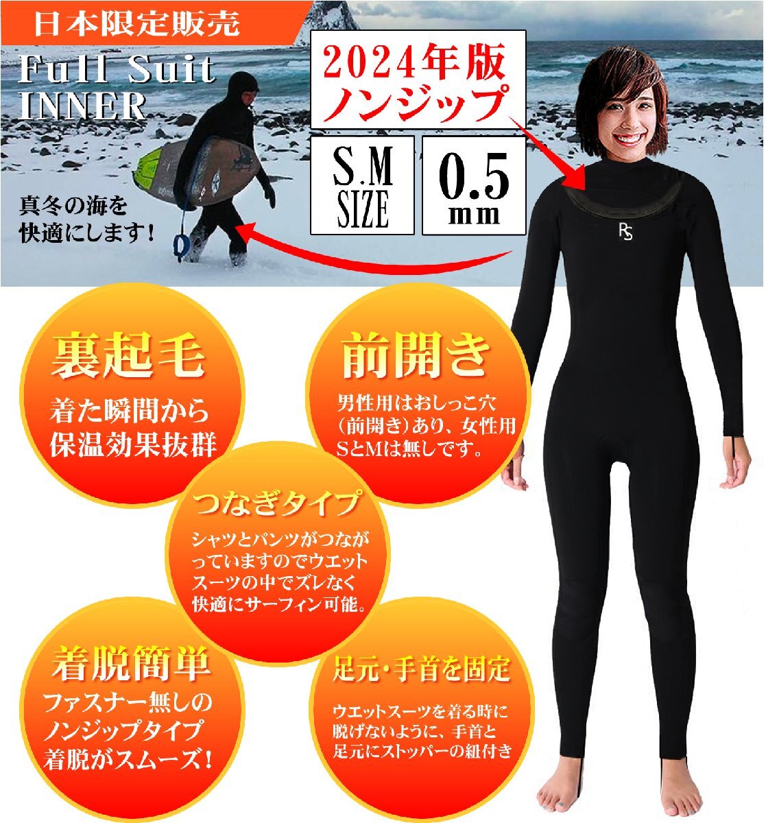 【お知らせ】 ※2024年モデルはノンジップタイプに変わりました。ノンジップタイプアンダーのつなぎタイプは日本初(世界初?)です。 女性用S,M各10枚以上はございます。 【素材】 ポリエステル85%,スパンデックス15% 【特徴】 ・真冬用の上下つなぎタイプ(シャツとパンツがくっついたワンピースタイプ)です。水が入りにくいセミドライやドライウェットスーツ専用、インナーシャツ・インナーパンツセット(アンダーシャツ・パンツセット)です。女性用前穴無しはS,Mサイズとなります。 ・優れた吸水速乾性、通気性によりいつでも肌さわりはドライ&暖かです。 ・柔らかい糸を使いながら、クッション性のある縫製で縫っています。ほどよいフィット感で体の動きを妨げない作りです。約0.5mmの薄さでウエットの中でもストレスなく着れます。 ・ウエットスーツを着る時に脱げないよう、足と手の先端にはストッパー(ゴム紐)が付いています。 ・裏地は起毛素材(マイクロウォームフリース)になっていますので、着用時のひんやりした感覚がなく、ハイネックなので着ているだけでかなり暖かいです。表地は滑らかなので、ウエットの着脱もスムーズです。 ・上下つながった「つなぎ」タイプなので、サーフィン中にシャツがめくれあがったり、パンツが下がったりすることはないです。 ・背中のファスナーをなくし、よりストレスが無いようにノンジップタイプのつなぎアンダーを開発いたしました。今まで以上に着脱がスムーズです。 バックジップのデメリット(背中・首回りにストレス、身体が硬いとファスナーの紐を引っ張り上げられない等)を解消しています。ノンジップなのでアウターフラップと呼ばれる被りのパーツと伸縮性のある肩口の二重構造になっており、フラップはベルクロでとめます。首回り・背中周りのストレスが少なくなっています。 【サイズについて】 S:155cm-160cm前後 M:165cm-170cm前後 【交換について】 交換ご希望の場合は、試着のみであればお受けします。返品にかかる送料はご負担ください。(レターパック等で返品いただき、こちらからの発送にかかる送料370円同封いただくか、新しいレターパック同封いただければ対応します) ・サーフィン 釣り SUP 海 マリンスポーツ に!