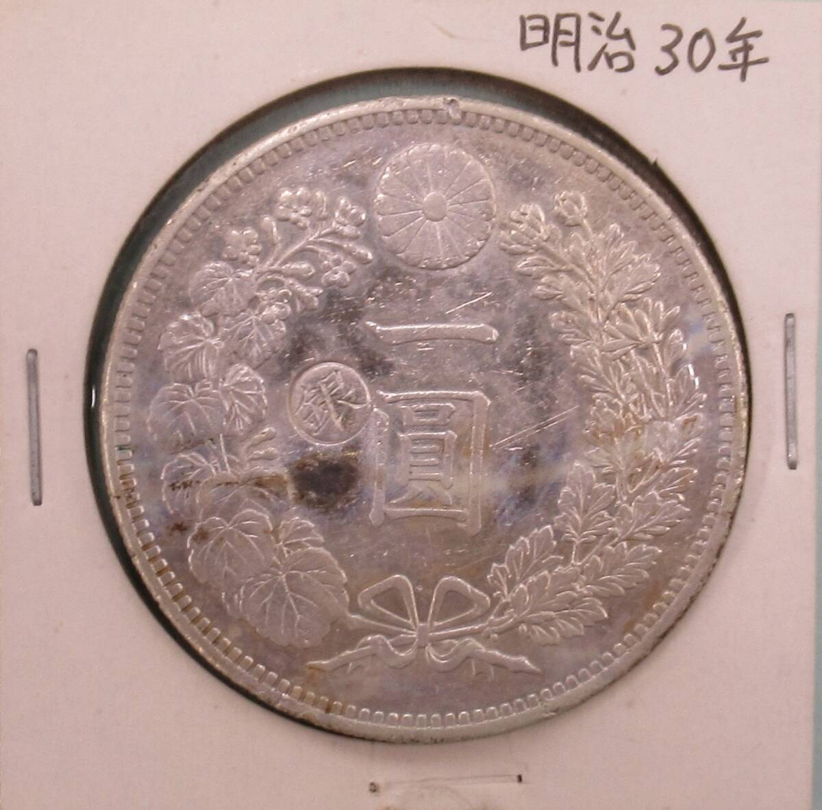 新1円銀貨(小型)明治29年 左 丸銀打ち 本物 美品. トーン有り