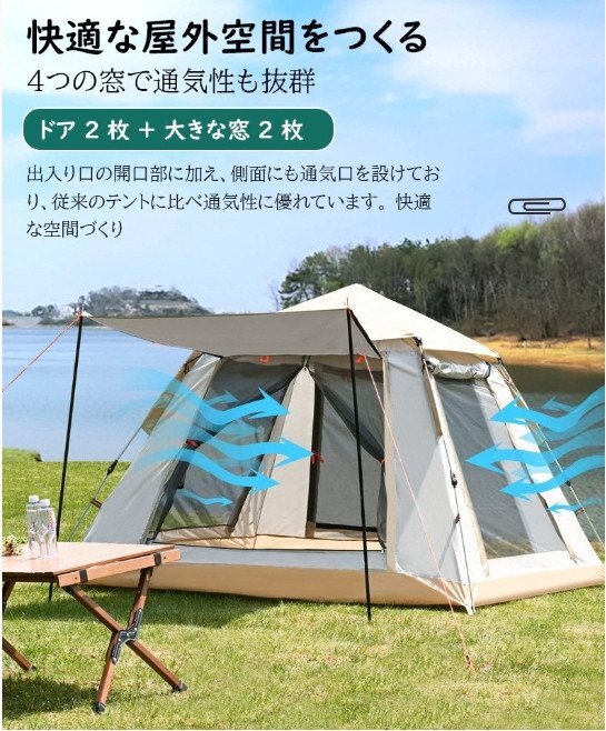 【快適な空間】 固定具(ペグ)なしでも自立するタイプで災害時の体育館など、前後4の扉があり開放感があり、