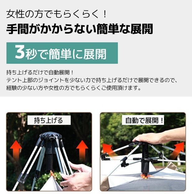 ペットボトル1本を持ち上げるほどの力でテント設営でき、テントを広げ紐を上に引くだけで組み立てでき所要時間は2秒です。