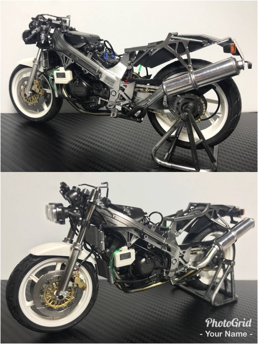 パーツ処理後、サフ、レーシングホワイト、レーシングブルー、調色ライトブルーをエアブラシ塗装。デカール貼り付け後にクリアーコート施工。 フレームは下地処理後にブラック、シルバー塗装。 マフラーはブラック、シルバー塗装にクリアーオレンジ、クリアーブルー、エナメルのブラウンにて焼け色を表現しました。 フロントフォークはシルバー、サイドミラーはブルーのミラーシート貼り付け。前後のブレーキディスクのクーリングホールはドリルでピンホール加工です。 |
