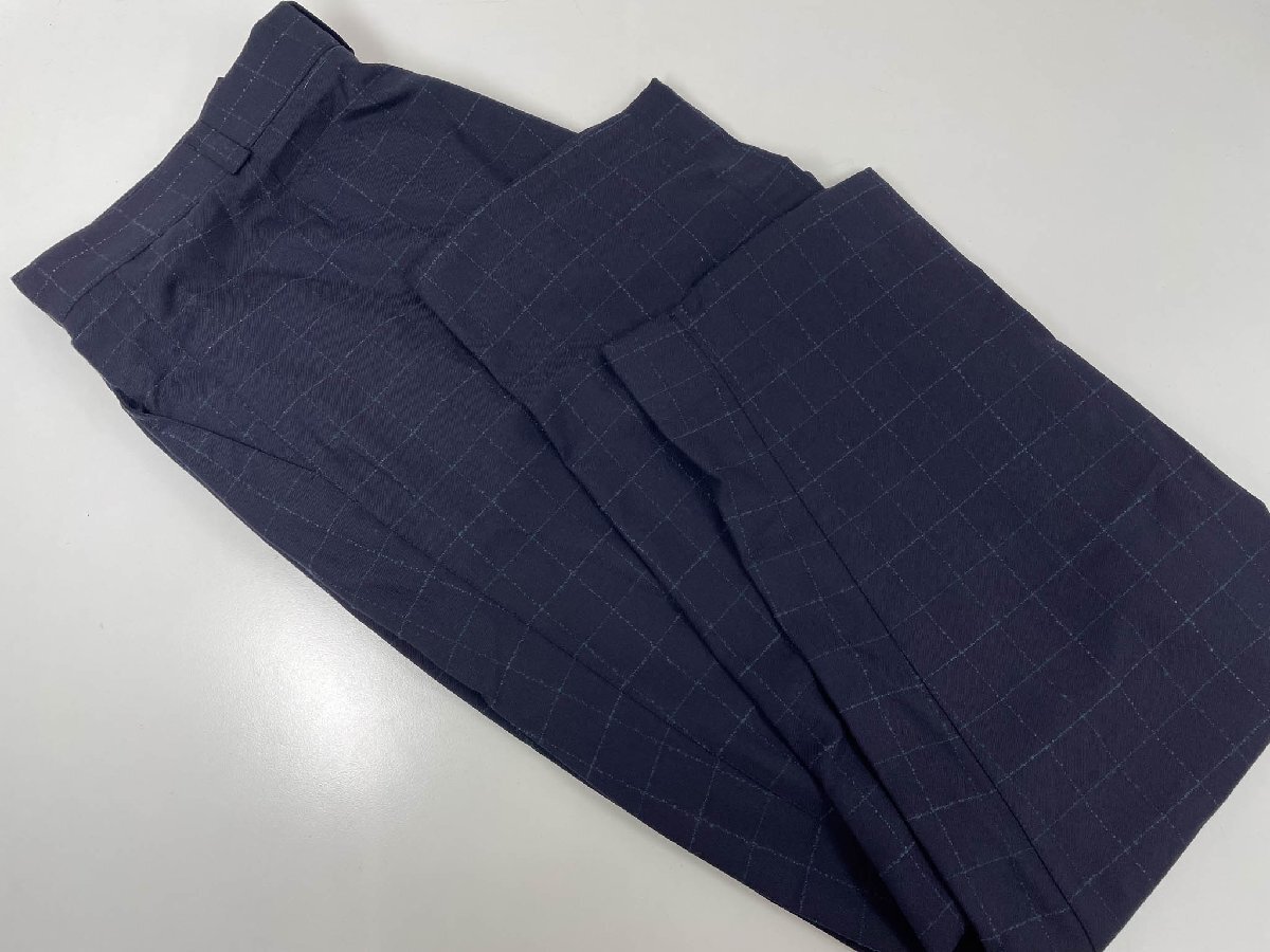 ・スラックス・・・ウエスト実寸約86センチ(2センチ出し、4センチ詰め可能)、股上約33センチ、渡り幅約38センチ、股下約81センチ、総丈約111センチ、裾幅約22センチ、シングル仕上げ(最大3センチ出しが可能です。)