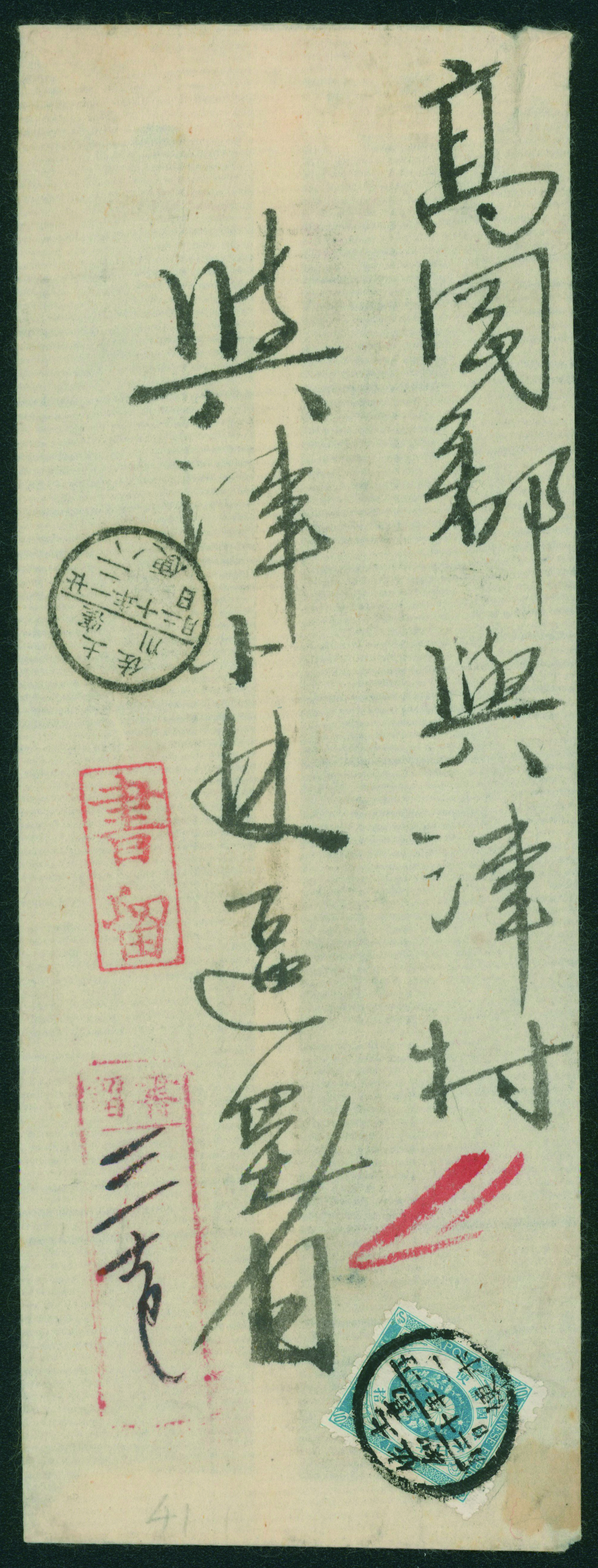 商品説明: 旧小判10銭 単貼り 丸一印 明治21 12 1 土佐/高知→興津村 到着印:土佐/窪川 明治21 12 2 書状書留重量便 カバーシミ 小破れJPS 71,