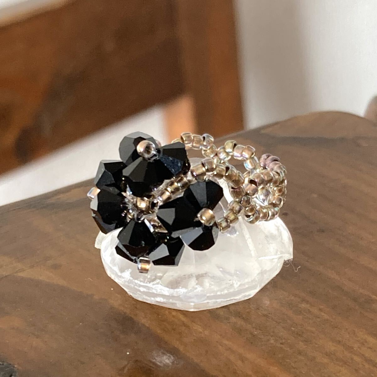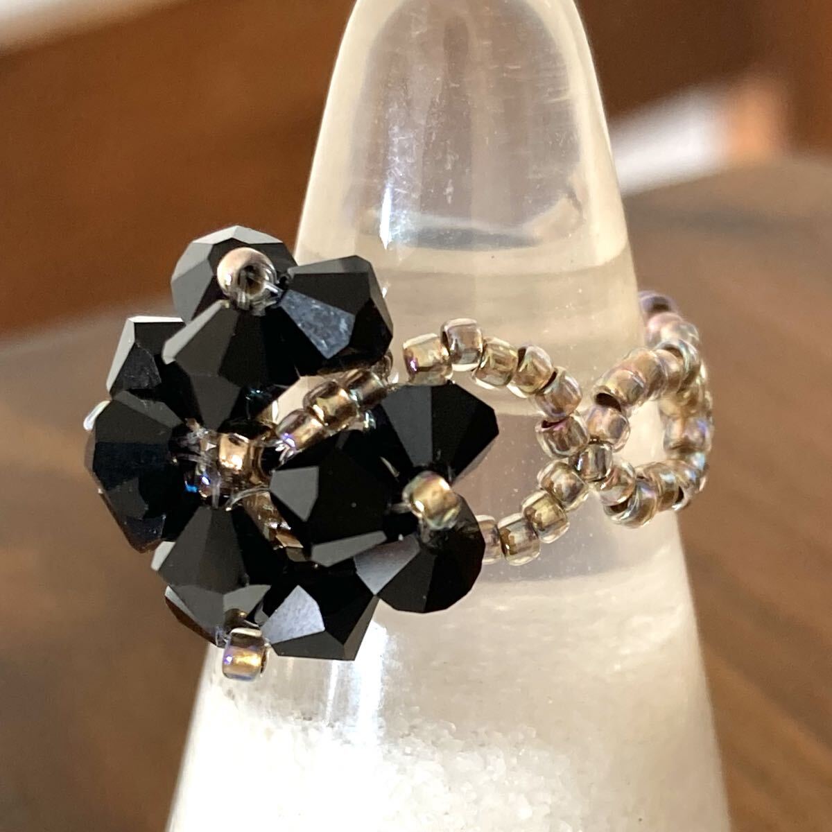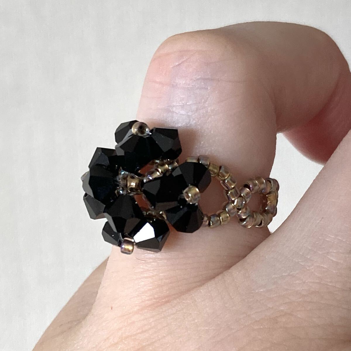 5mmの黒のスワロフスキー、クリアゴールド系の丸小ビーズで作ったリングです。