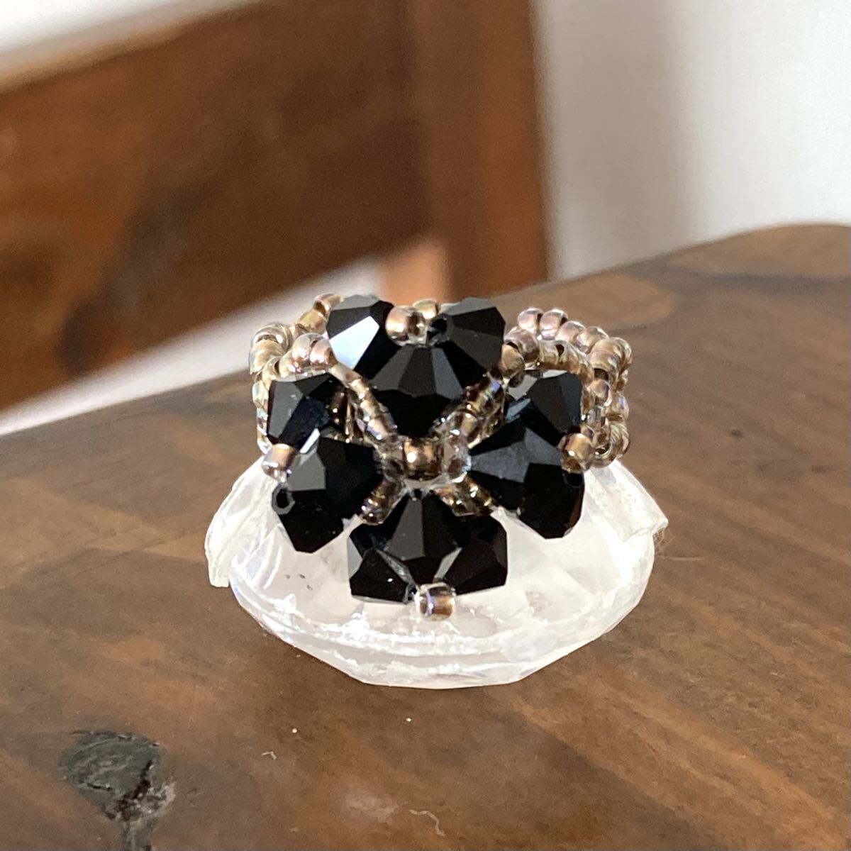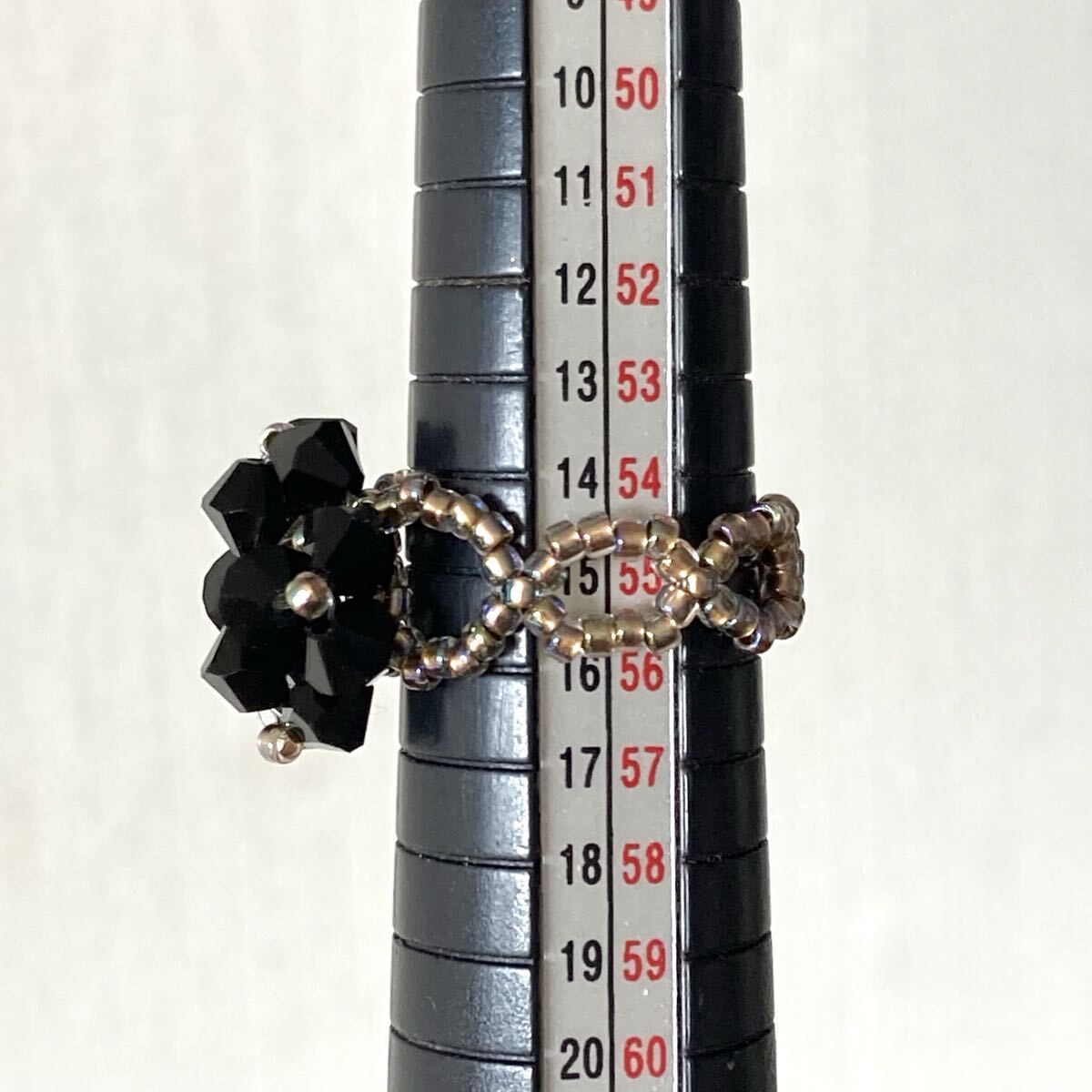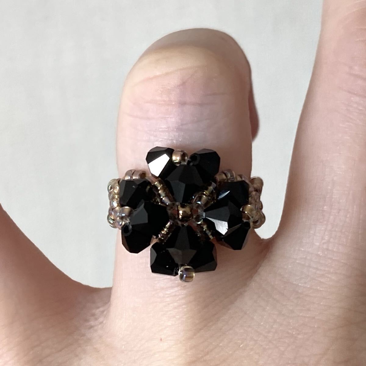 ビーズ リング 指輪 スワロフスキーのクローバー風リング 黒×ゴールド 14-16号です。